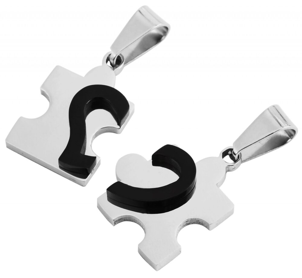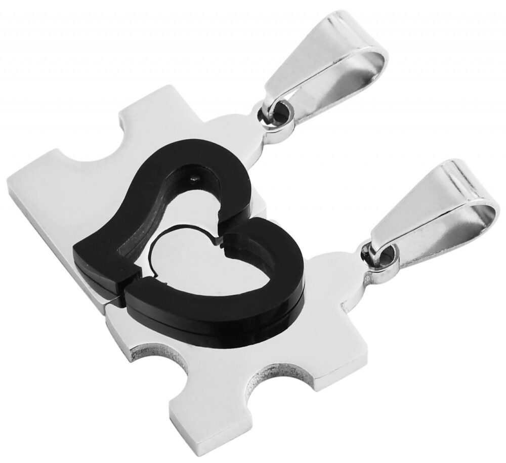 Os pendentes com a forma de uma peça de puzzle da marca Akzent são feitos de aço inoxidável e são também revestidos com iões. Este processo melhora o aspeto do material. O material também promete uma longa vida útil. Os pingentes de aço inoxidável são compostos por duas partes, o que os torna ideais como pingentes de amizade ou de parceiro. As duas peças do puzzle são prateadas e estão decoradas com um coração preto no meio. As dimensões são: comprimento 29 mm, largura 22 mm e espessura 4 mm.