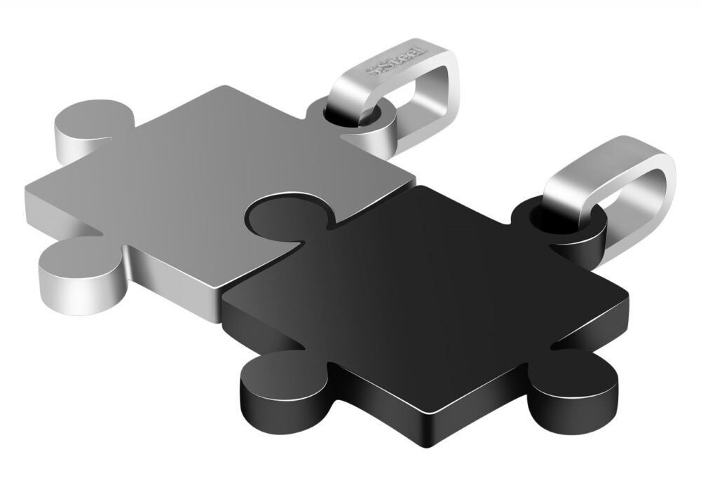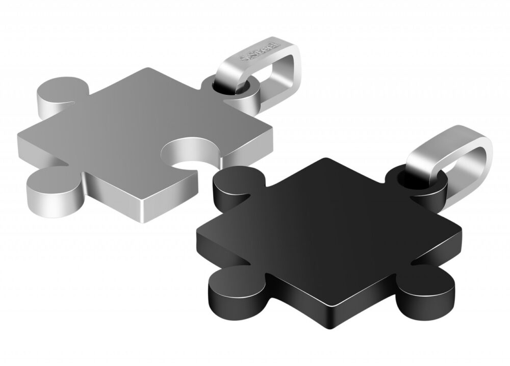 Os pingentes da marca Accent são feitos de aço inoxidável e estão disponíveis em diversas cores. O material é robusto e promete longa vida útil. O pingente consiste em duas peças do quebra-cabeça que podem ser usadas juntas ou individualmente. Perfeito como pingente de amizade ou parceiro que pode ser gravado conforme desejado. O tamanho do pingente tem 27 mm de comprimento, 42 mm de largura e 2 mm de espessura. Observe que um colar não está incluído.