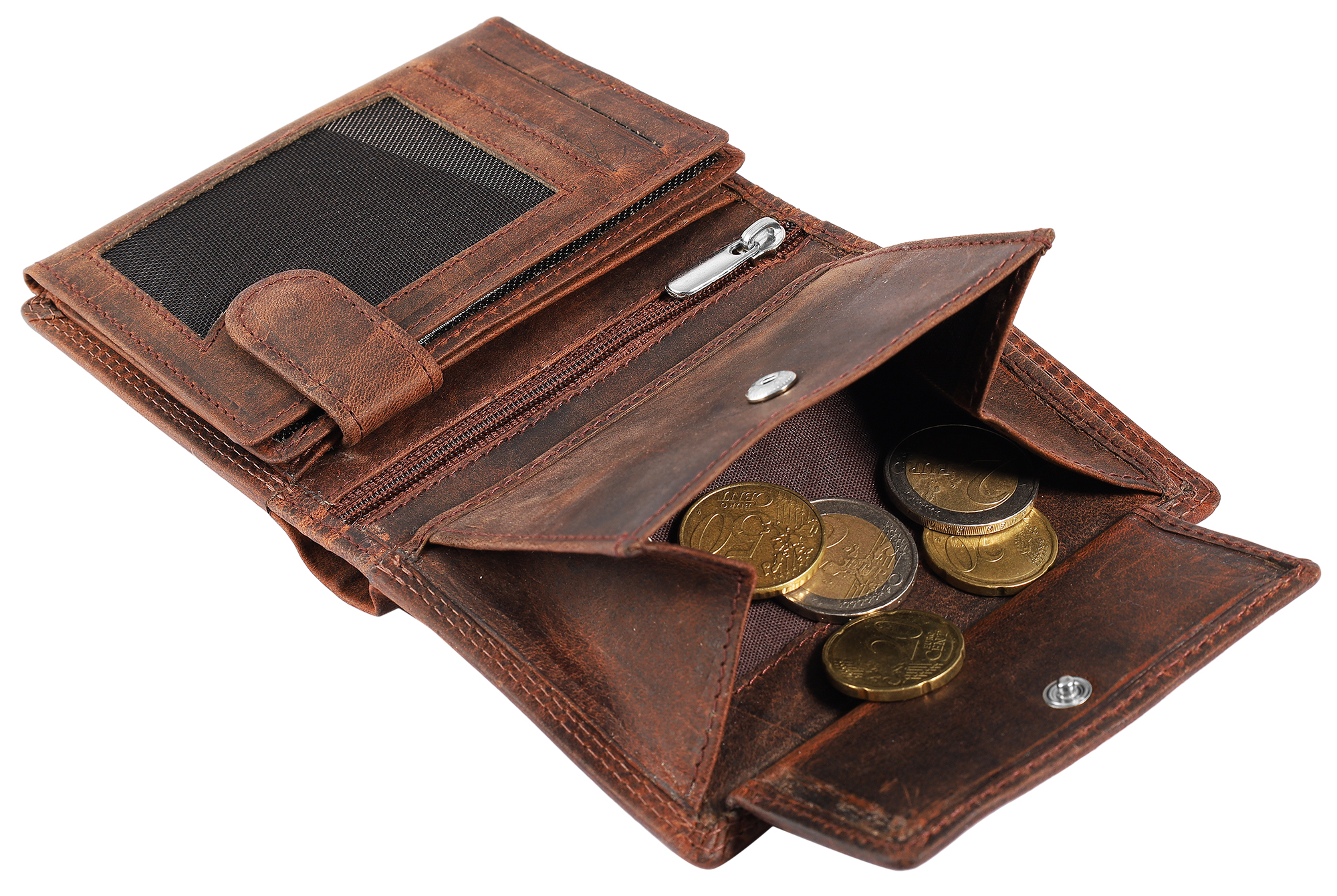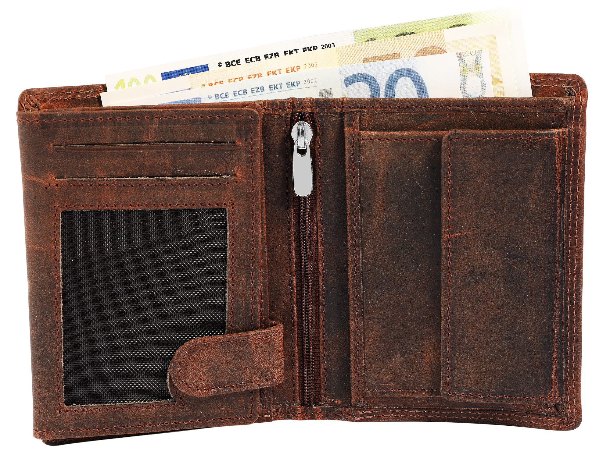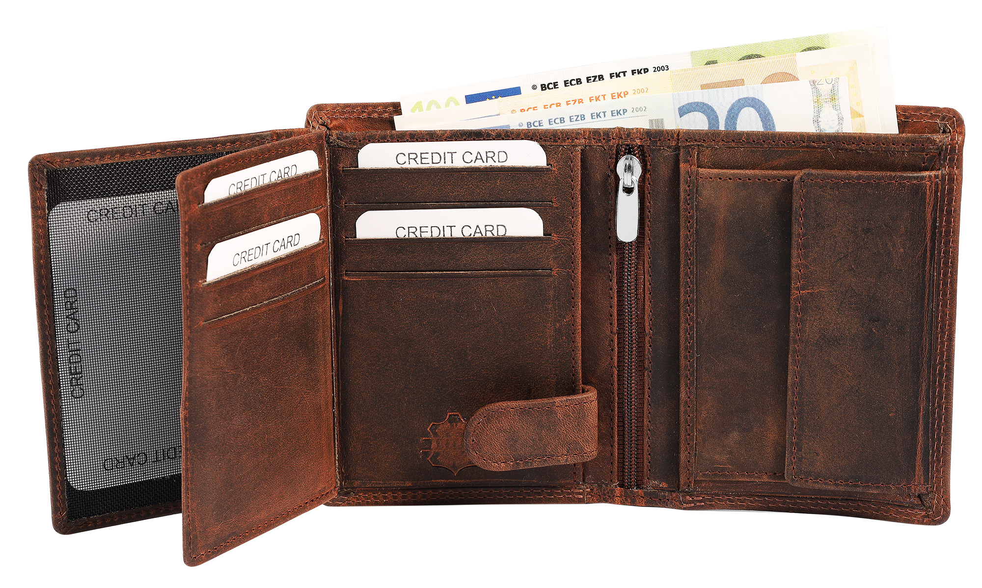 - Tem 9 compartimentos para cartões de crédito, 2 compartimentos para notas, 1 compartimento para moedas com fecho de pressão, 1 compartimento interno com zíper, 2 bolsos internos e 3 bolsos transparentes para documentos de identidade, e um fecho de pressão extra interno mantém seus cartões seguros.