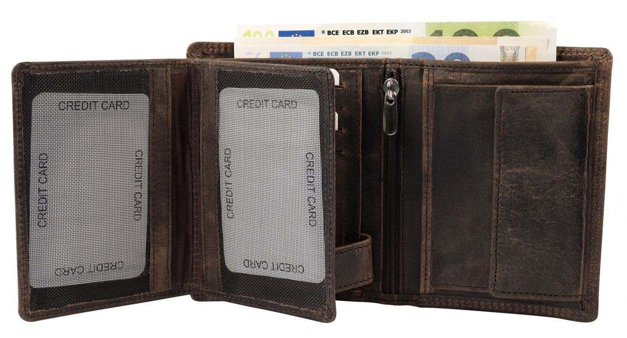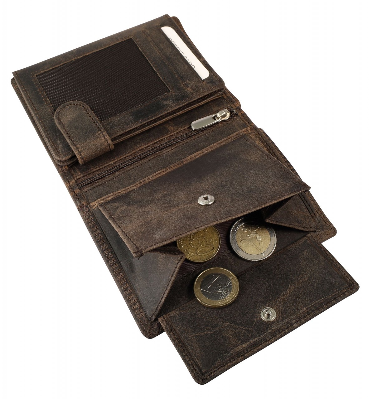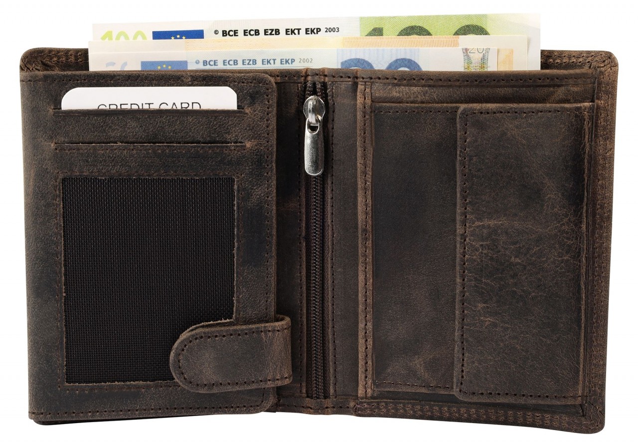 A carteira Akzent é feita de couro genuíno em formato de retrato e tem um design inconfundível graças ao relevo em forma de âncora. A carteira é uma verdadeira poupança de espaço e oferece muito espaço de armazenamento para todos os seus documentos importantes. A costura dupla no exterior e no interior garante uma boa durabilidade e estabilidade. Graças à sua disposição prática, dispõe de 9 ranhuras para cartões de crédito, 2 compartimentos para notas, 1 compartimento para moedas com fecho de pressão, 1 compartimento com fecho de correr no interior, 2 bolsos deslizantes e 3 compartimentos transparentes para cartões de identificação. O tamanho não preenchido é de 9 cm de comprimento, 12 cm de largura e 2 cm de espessura. Um ótimo acessório com o tamanho perfeito para o uso diário.