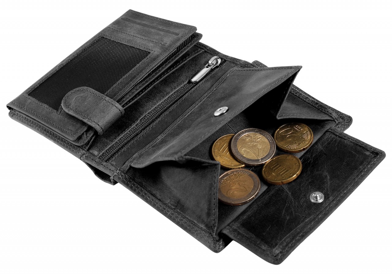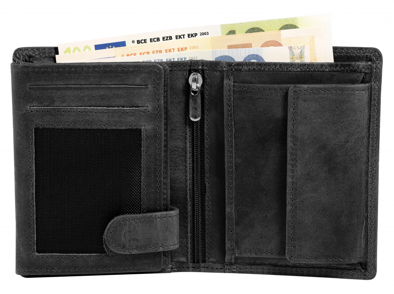 • Tem 9 compartimentos para cartões de crédito, 2 compartimentos para notas, 1 compartimento para moedas com fecho de pressão, 1 compartimento interno com zíper, 2 bolsos internos e 3 bolsos transparentes para documentos de identidade, e um fecho de pressão extra interno mantém seus cartões seguros.
