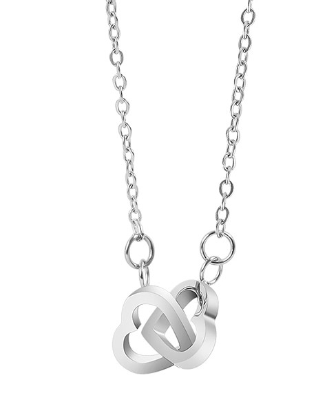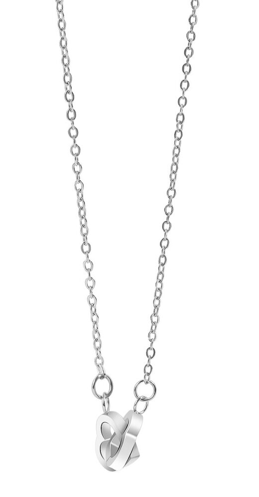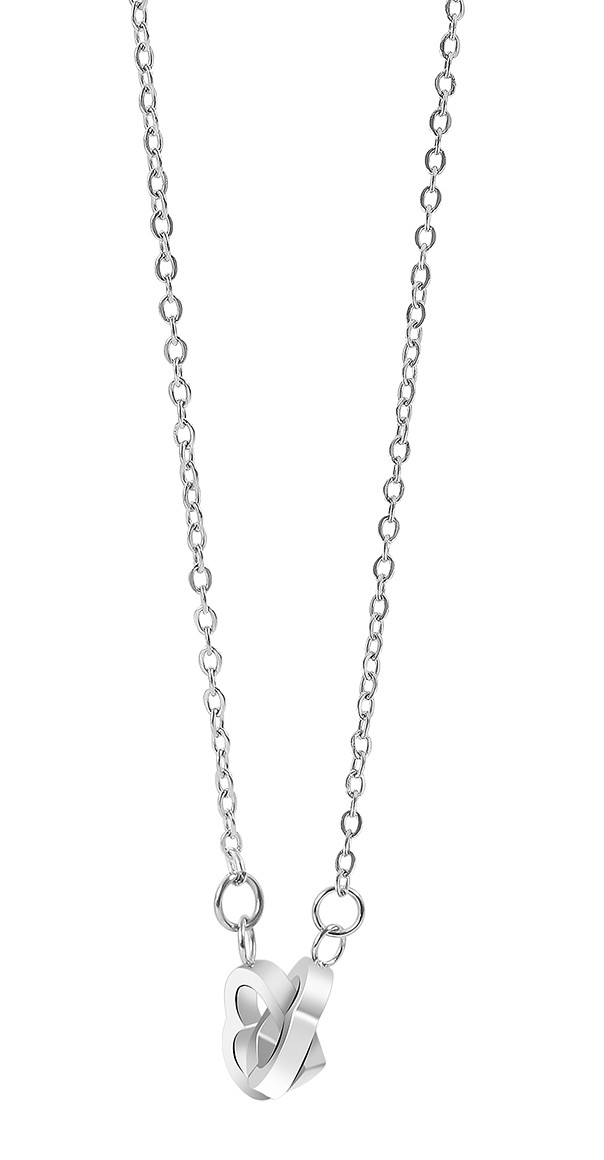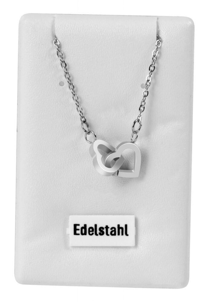 O colar da marca Akzent é feito de aço inoxidável em padrão âncora. É interrompido ao meio por um pendente, também em aço inoxidável. Dois corações entrelaçados combinam-se para formar uma imagem geral elegante. O material é muito robusto, durável e ideal para quem sofre de alergias, uma vez que o aço inoxidável é particularmente amigo da pele. A corrente de joias pode ser aberta e fechada com um mosquetão, o que garante uma fixação segura e evita que ela se abra sozinha. Além disso, em uma das pontas da corrente é fixada uma corrente extensora de 5 cm de comprimento, que permite variar o comprimento em até 5 cm e, portanto, pode ser adaptada a qualquer roupa. As dimensões são 43 cm de comprimento e 1 mm de espessura.
