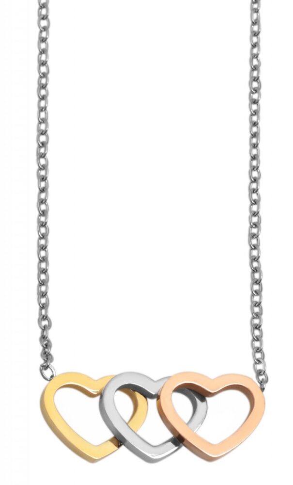O colar da marca Akzent é feito de aço inoxidável num padrão de âncora. Um pendente com três corações está preso à corrente. A corrente de joalharia moderna pode ser aberta e fechada com um fecho de lagosta, também em aço inoxidável. Uma corrente de extensão de 5 cm está também ligada a uma extremidade da corrente, permitindo-lhe variar o comprimento até 5 cm e adaptá-la a qualquer roupa. As dimensões resultam de um comprimento de 43 cm e de uma espessura de 1 mm. O pendente tem um comprimento de 10 mm, uma largura de 25 mm e uma espessura de 4 mm.