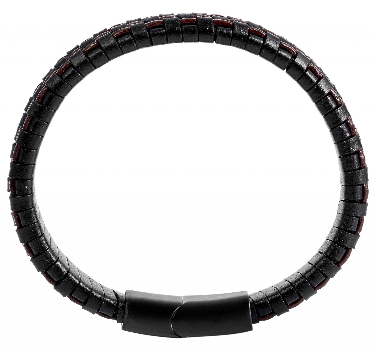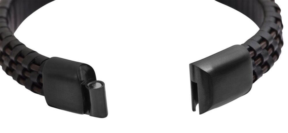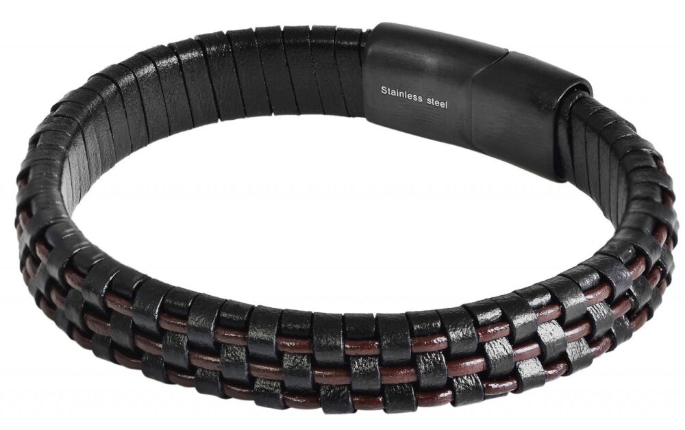 Esta pulseira preta da marca Akzent é feita de couro genuíno e está disponível em diferentes comprimentos. É constituída por tiras de couro entrançado, com tiras de couro castanho escuro incorporadas em intervalos iguais. A técnica de entrançamento elaborada e os acentos de cores diferentes conferem à pulseira um aspeto casual. A bracelete também tem um fecho revestido a preto que pode ser facilmente acionado com um mecanismo magnético. A bracelete tem 12 mm de largura e 6 mm de espessura.