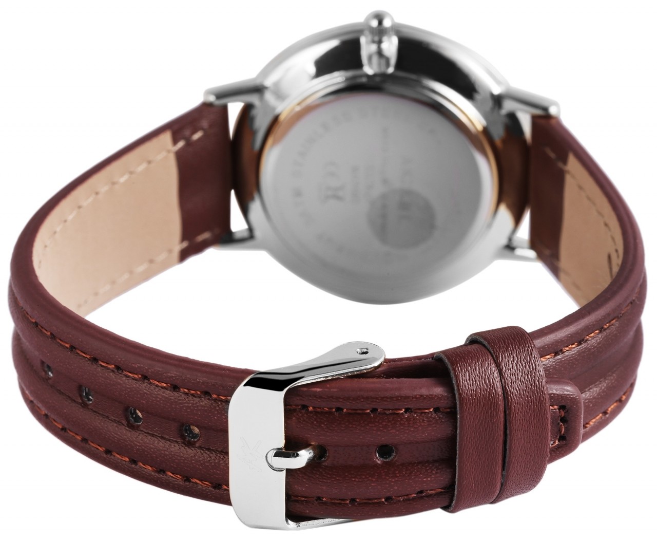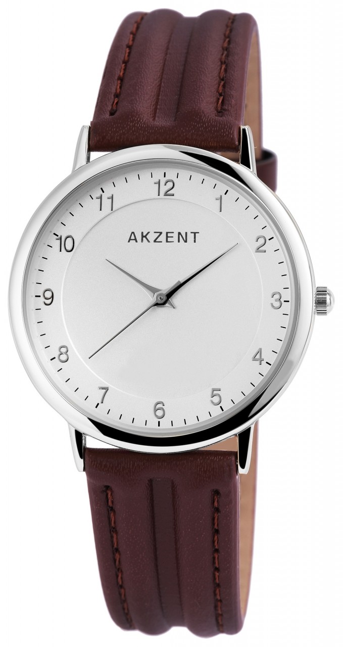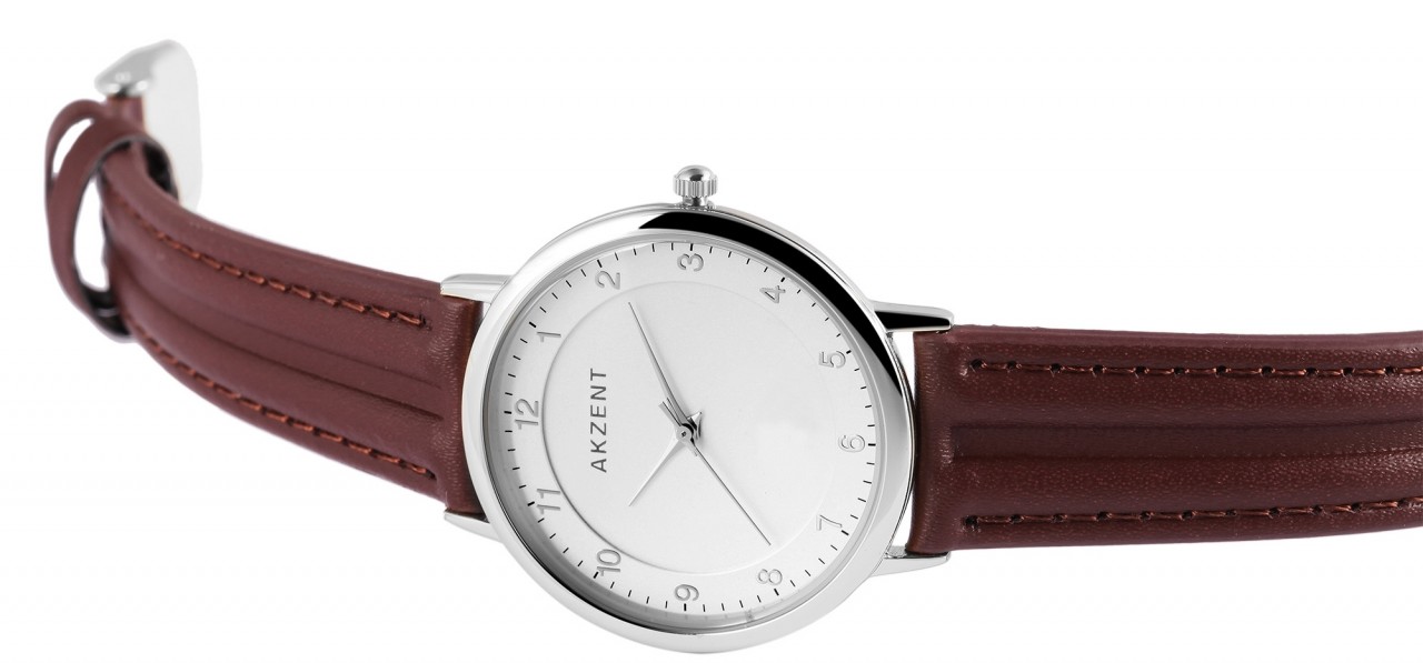 O relógio analógico Akzent para homem tem um movimento de quartzo de alta qualidade. A bracelete em imitação de pele tem 18 mm de largura e abre-se com uma fivela de pino. O comprimento total é de 23 cm. A caixa metálica com vidro mineral mede 37 mm e tem 9 mm de altura. A tampa da caixa é feita de aço inoxidável. O relógio é testado a uma pressão de 3 ATM.