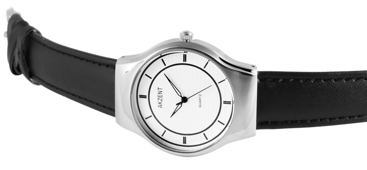 O relógio analógico Akzent para homem tem um movimento de quartzo de alta qualidade. A bracelete em imitação de pele tem 20 mm de largura e abre-se com uma fivela de pino. O comprimento total é de 24 cm. A caixa metálica com vidro mineral mede 40 mm e tem 9 mm de altura. A tampa da caixa é feita de aço inoxidável. O relógio é testado a uma pressão de 3 ATM.