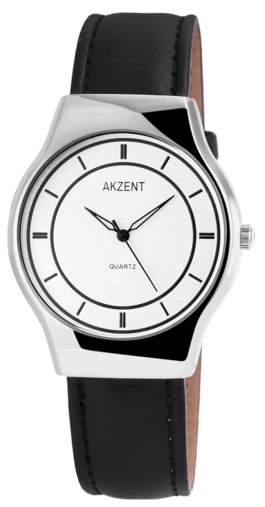 O relógio analógico Akzent para homem tem um movimento de quartzo de alta qualidade. A bracelete em imitação de pele tem 20 mm de largura e abre-se com uma fivela de pino. O comprimento total é de 24 cm. A caixa metálica com vidro mineral mede 40 mm e tem 9 mm de altura. A tampa da caixa é feita de aço inoxidável. O relógio é testado a uma pressão de 3 ATM.