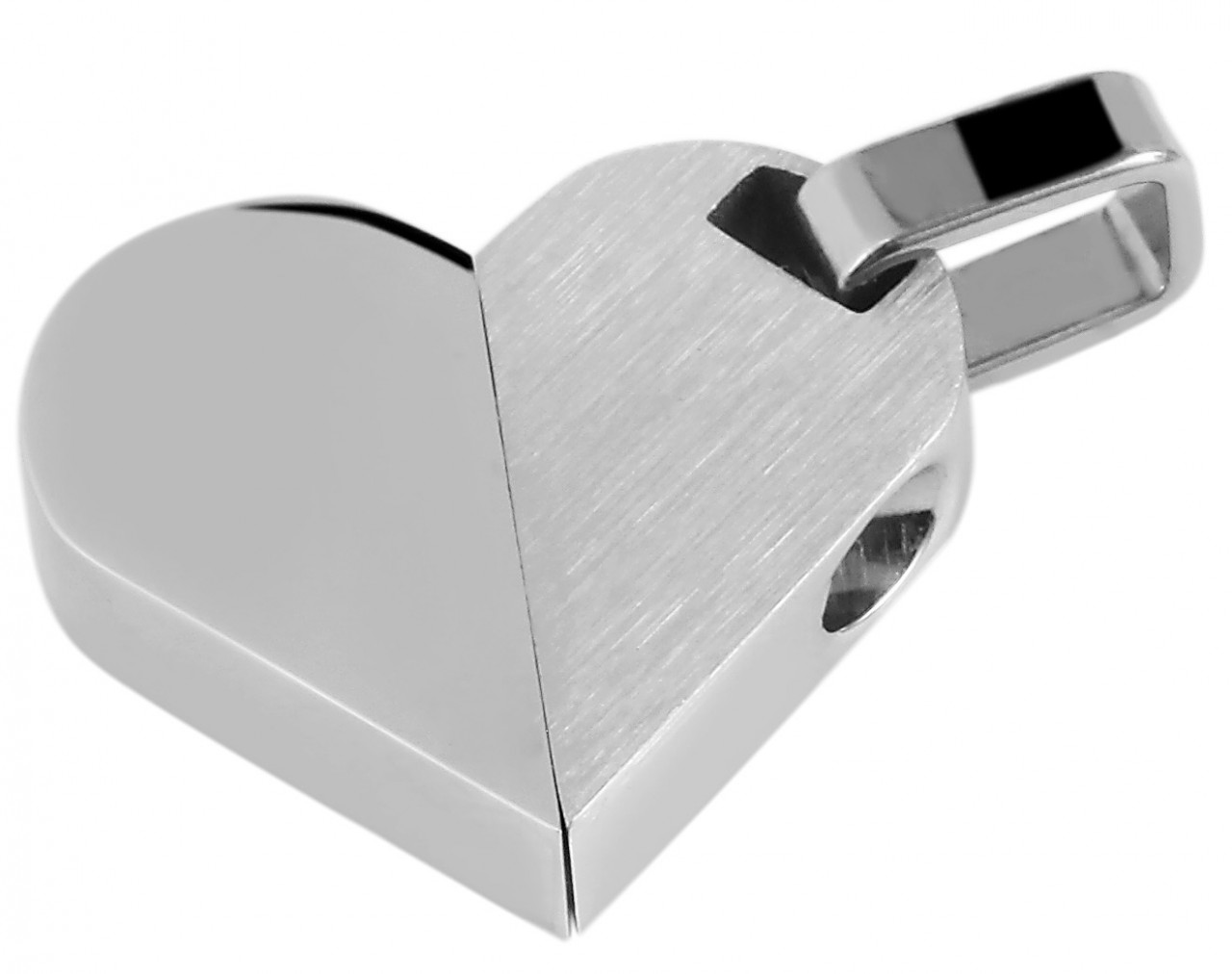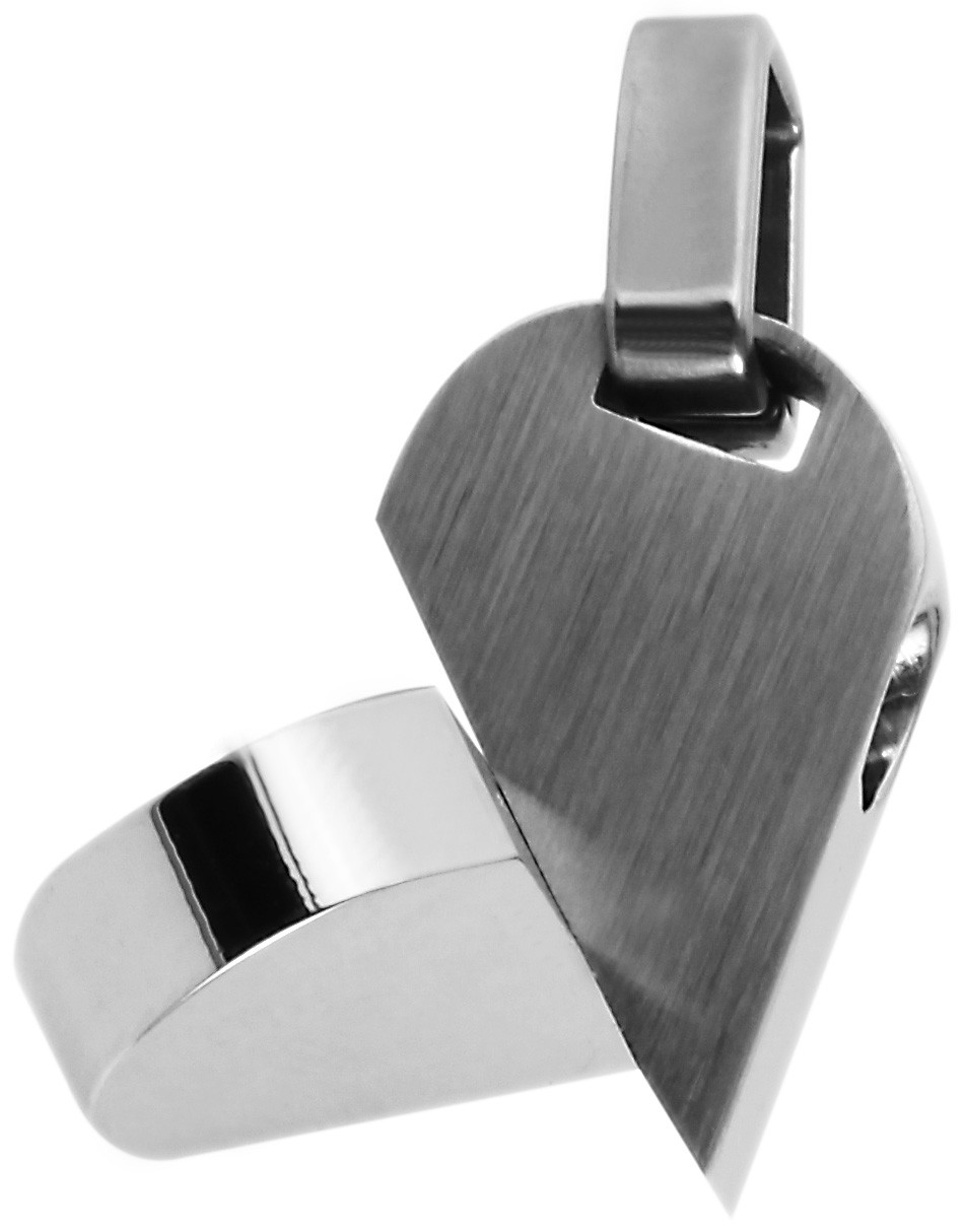O pingente da marca Akzent em forma de coração é feito em aço inoxidável e é adequado para todos os tipos de gravuras. O material em aço inoxidável promete uma longa vida útil. O pingente de coração é unido no meio com um parafuso para que o pingente possa ser redesenhado individualmente simplesmente girando-o. Ao dividir o visual fosco e brilhante, o pingente simples é realçado. As dimensões são: 18 mm de comprimento, 21 mm de largura e 4 mm de espessura.