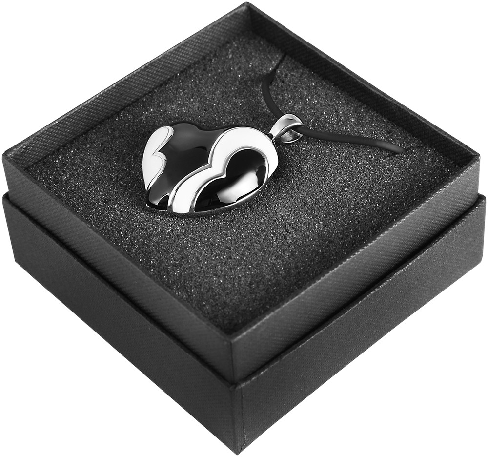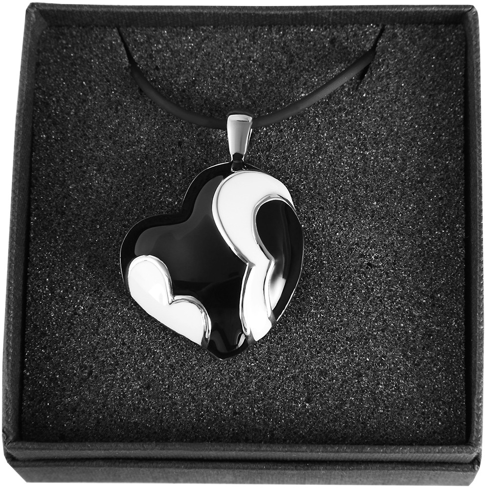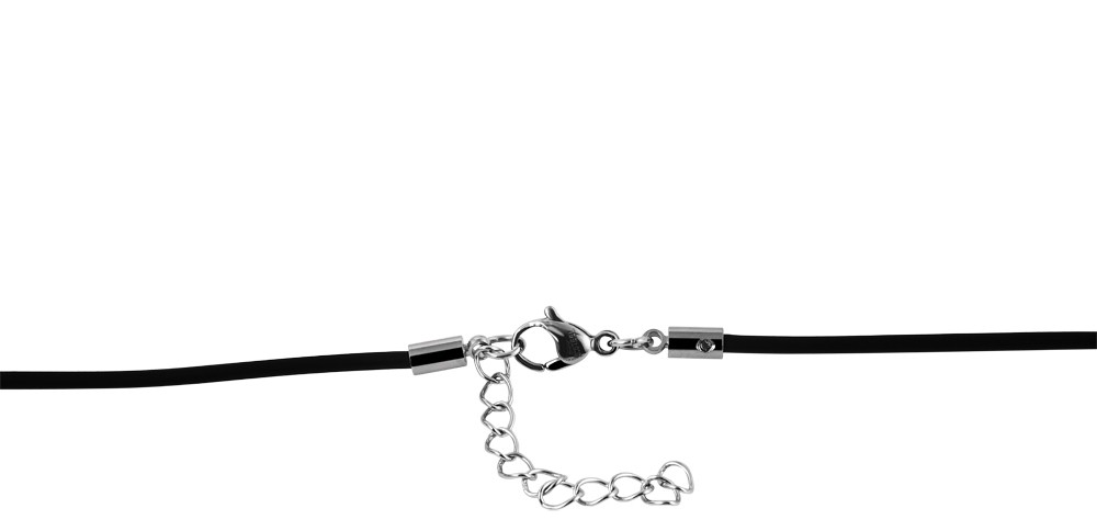 O colar da marca Akzent é feito de borracha. O colar é apresentado em preto. A corrente é fixada na parte de trás do pescoço com um fecho de lagosta em aço inoxidável. A corrente tem 50 cm de comprimento. Se necessário, pode ser aumentada em 5 cm, para que possa ser personalizada. A corrente tem uma espessura de 2 mm. O colar tem também um pendente em aço inoxidável. O tamanho do pendente é de 35 mm de largura e 38 mm de altura. O pendente é de cor preta.