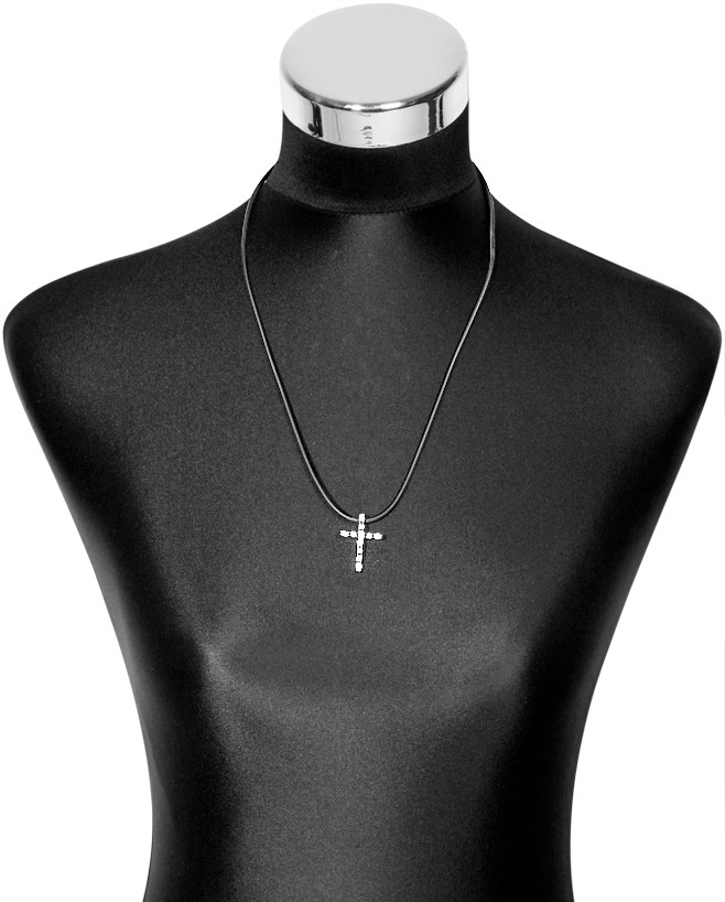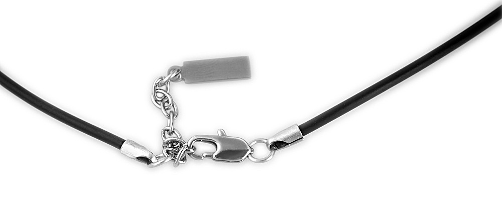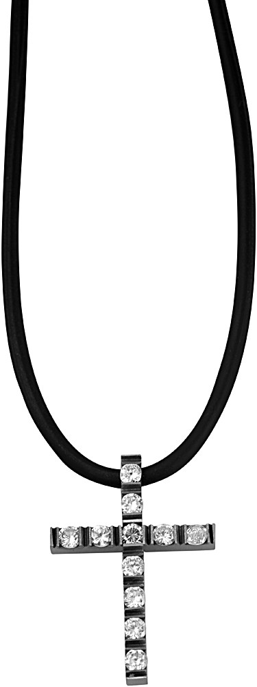 Este colar da marca Akzent é feito de borracha. A corrente é preta e prateada. A corrente é fixada na parte de trás do pescoço com um fecho de lagosta. O comprimento da corrente é de 50 cm. A corrente tem 2 mm de espessura. O colar tem também um pendente em aço inoxidável. O tamanho do pendente é de 21 mm de largura e 30 mm de altura. O destaque visual é o pendente cravejado de cristais de zircónia. O pendente é prateado.