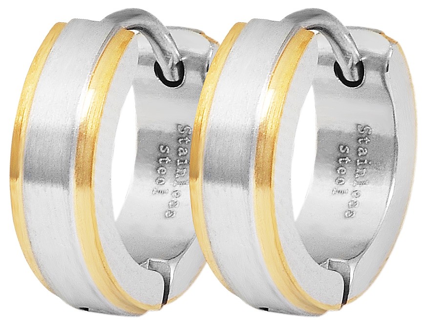 Os brincos de argola dobráveis da marca Praktik são feitos de aço inoxidável. Têm um diâmetro de 9 mm, uma largura de 4 mm e uma espessura de material de 2 mm. A aparência dos brincos de argola é fosca e polida. As bordas externas de 1 mm de largura são douradas e brilhantes, a parte central de 2 mm de largura é fosca e prateada. Os diferentes acabamentos de superfície e cores fazem destes brincos um acessório muito especial, adequado para jovens e idosos e para qualquer ocasião. Eles são fechados com um prático fecho dobrável que pode ser operado facilmente e garante uma fixação segura no orifício da orelha. Dê os brincos especiais de presente a uma pessoa especial ou mime-se. Seja no dia a dia ou em uma ocasião de negócios, os brincos de argola podem ser usados em qualquer ocasião.
