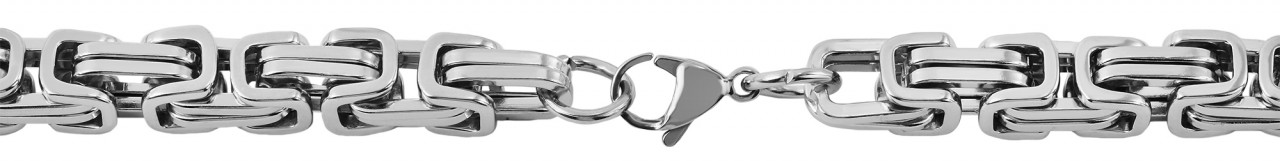 A corrente bizantina prateada da marca Praktik é feita de aço inoxidável. As dimensões do colar são comprimento total de 55 cm e espessura de 8 mm. A corrente pode ser aberta e fechada com um mosquetão prateado, também feito de aço inoxidável. As correntes e pulseiras King são conhecidas por seu design masculino e sólido. Destacam-se pelos inúmeros elementos que se interligam de forma especial e completam qualquer look forte.