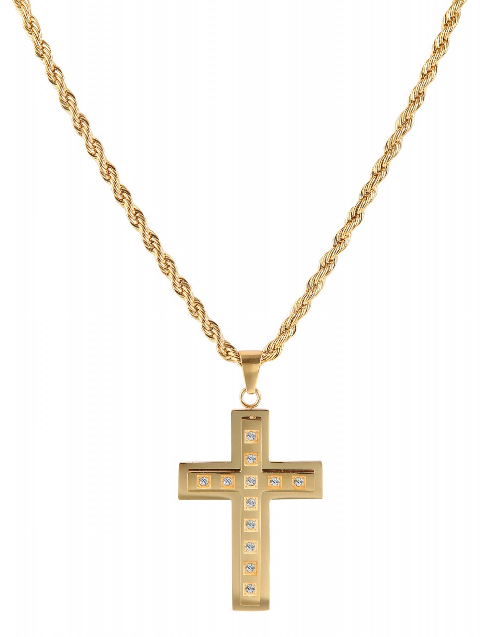 O colar da marca Praktik é feito de aço inoxidável em padrão de cordão e equipado com um expressivo pingente de aço inoxidável em forma de cruz. Este é um atrativo absoluto e se apresenta com confiança em sua aparência radiante. Graças ao visual “twin look”, há outra cruz na cruz de aço inoxidável, que é decorada com doze pedras simil brilhantes. O formato em espiral dos fios da corrente também confere ao colar um charme muito especial. A parte de trás do pingente é fosca e oferece espaço suficiente para ser gravado individualmente com pequenas gravuras. Pela possibilidade de gravuras pessoais, a corrente é uma companheira indispensável do dia a dia e ideal como presente. O comprimento total da corrente é de 61 cm.