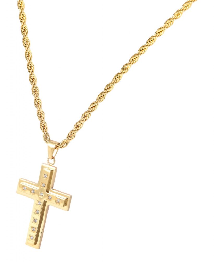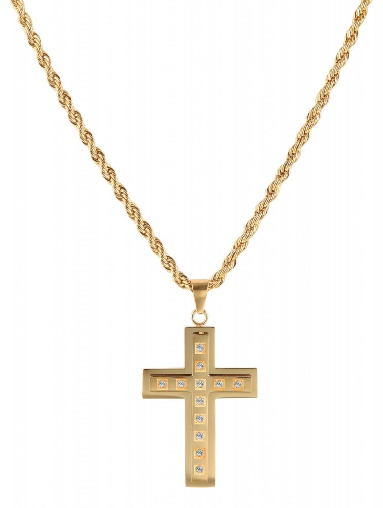O colar da marca Praktik é feito de aço inoxidável em padrão de cordão e equipado com um expressivo pingente de aço inoxidável em forma de cruz. Este é um atrativo absoluto e se apresenta com confiança em sua aparência radiante. Graças ao visual “twin look”, há outra cruz na cruz de aço inoxidável, que é decorada com doze pedras simil brilhantes. O formato em espiral dos fios da corrente também confere ao colar um charme muito especial. A parte de trás do pingente é fosca e oferece espaço suficiente para ser gravado individualmente com pequenas gravuras. Pela possibilidade de gravuras pessoais, a corrente é uma companheira indispensável do dia a dia e ideal como presente. O comprimento total da corrente é de 61 cm.