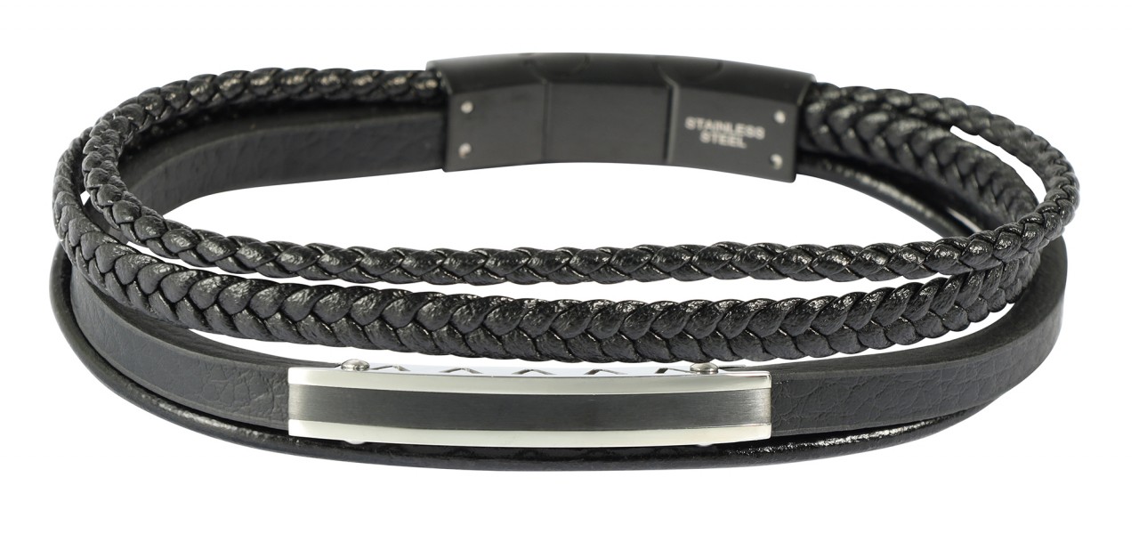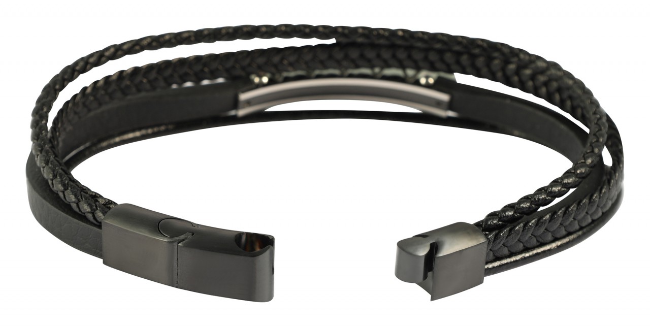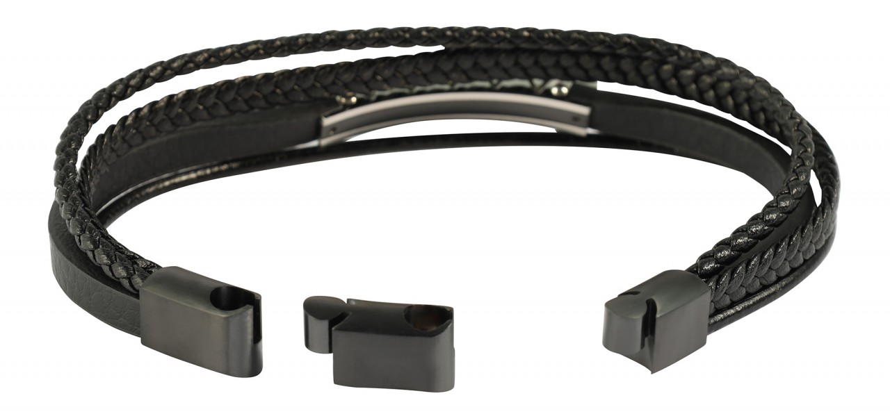 A pulseira “Marcellino” impressiona pelos seus quatro fios diferentes, às vezes trançados, torcidos ou lisos, feitos de pele sintética de alta qualidade. A placa de gravação bicolor com superfície preta fosca e bordas prateadas polidas oferece espaço suficiente para uma mensagem pessoal ou iniciais. O robusto fecho magnético feito de aço inoxidável na cor preta garante uma fixação segura e um visual masculino. Além disso, uma extensão adicional de 1 cm permite um ajuste flexível a qualquer pulso. Perfeito como presente para ocasiões especiais ou como destaque especial em sua linha de joias.