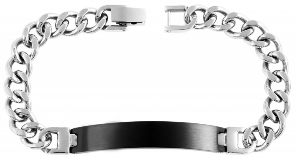 A pulseira é feita de aço inoxidável e tem uma placa gravada de 4,1 cm de comprimento no meio. As dimensões resultam de um comprimento total de 21 cm, largura de 0,8 cm e espessura do material de 3 mm. A placa de gravação tem 2,5 mm de espessura e 0,8 cm de largura. A pulseira sólida pode ser aberta e fechada com um mosquetão, que também é feito de aço inoxidável. A superfície da joia atraente é altamente polida. A placa de gravação, ou placa de identificação, é fosca e adequada para gravação. Uma joia personalizada é um excelente presente.