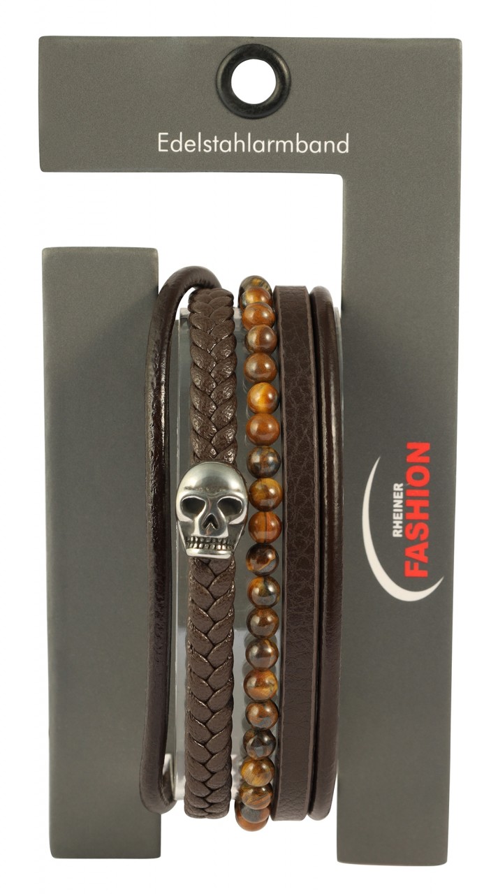 A pulseira “Perry” caracteriza-se pela sua estrutura variada, criada a partir da combinação de diferentes texturas de pele sintética. Os tons quentes e terrosos das pedras castanhas de olho de tigre conferem à pulseira uma elegância natural, enquanto o atraente pingente em forma de caveira em aço inoxidável adiciona um toque rebelde ao design. Graças ao fecho magnético robusto, a pulseira é fácil de colocar e retirar, e assenta com segurança no pulso. As diferentes opções de comprimento garantem que você encontre o ajuste perfeito para o seu pulso. Tamanhos disponíveis: 17 cm, 19 cm e 23 cm.