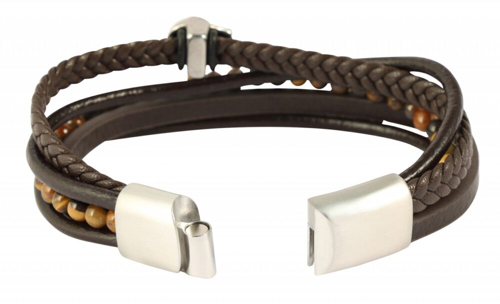 A pulseira “Perry” caracteriza-se pela sua estrutura variada, criada a partir da combinação de diferentes texturas de pele sintética. Os tons quentes e terrosos das pedras castanhas de olho de tigre conferem à pulseira uma elegância natural, enquanto o atraente pingente em forma de caveira em aço inoxidável adiciona um toque rebelde ao design. Graças ao fecho magnético robusto, a pulseira é fácil de colocar e retirar, e assenta com segurança no pulso. As diferentes opções de comprimento garantem que você encontre o ajuste perfeito para o seu pulso. Tamanhos disponíveis: 17 cm, 19 cm e 23 cm.