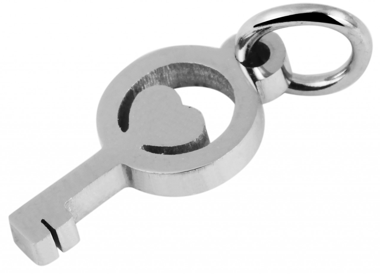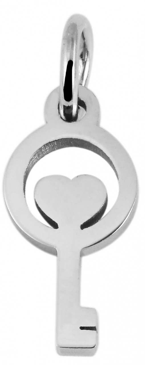 O pingente da marca Akzent em formato de chave é feito de aço inoxidável e na cor prata. Existem pequenos recortes na cabeça da chave que fazem aparecer um coração. As dimensões do pingente são 14 mm de comprimento, 7 mm de largura e 1 mm de espessura.
