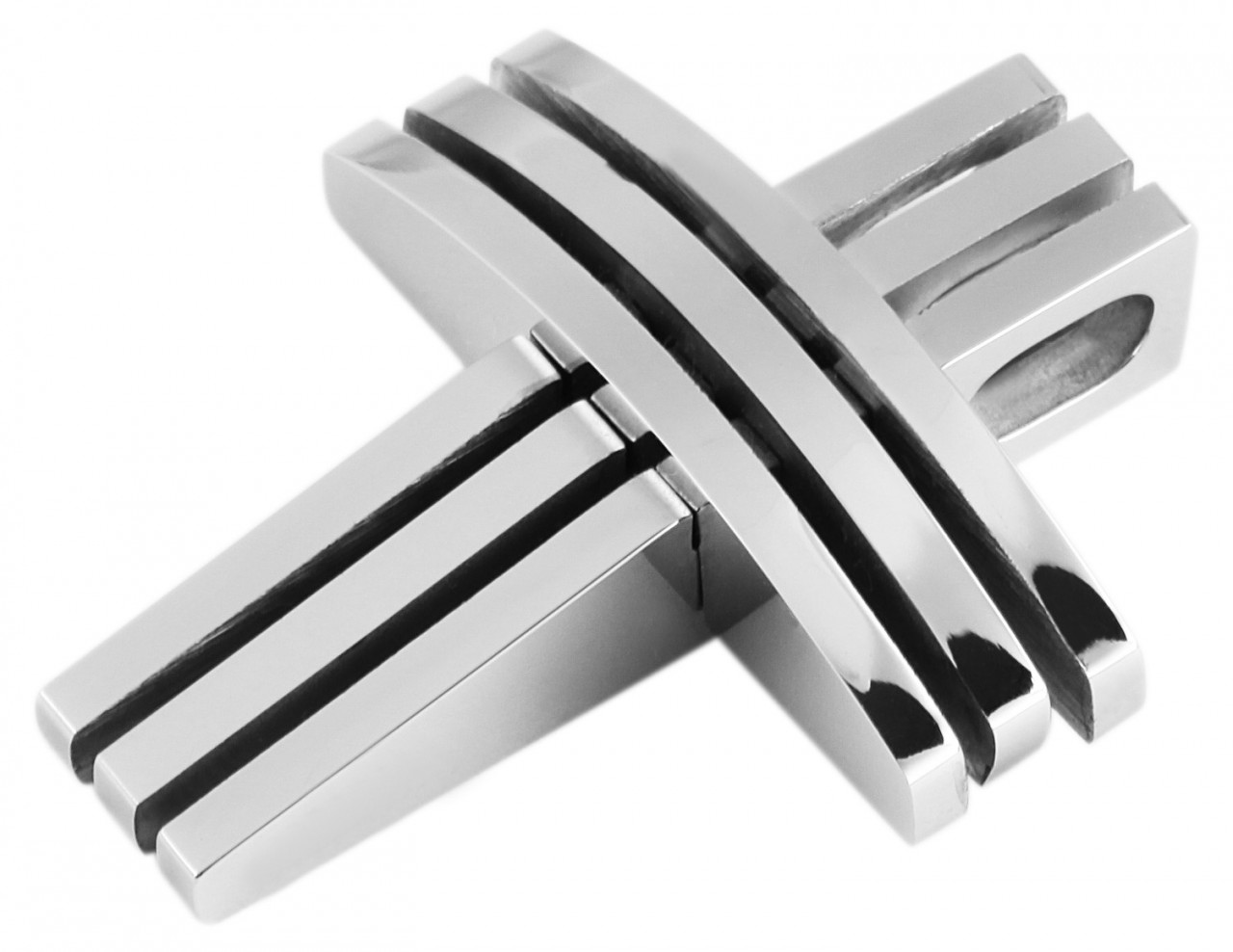 O pingente da marca em forma de cruz é feito de aço inoxidável. Este material promete uma longa vida útil. A cruz ligeiramente arqueada consiste em três vigas verticais e horizontais. As dimensões são: comprimento 33 mm, largura 27 mm e espessura 8 mm.