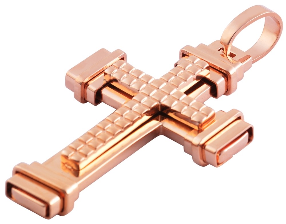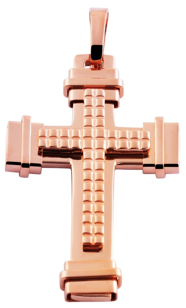O pingente em forma de cruz da marca Akzent é feito de aço inoxidável e possui revestimento iônico adicional. Este processo altera a aparência do aço inoxidável. A enorme cruz tem outra cruz menor com um padrão quadrado soldado nela. As quatro extremidades são cobertas por um ilhó largo e angular. A frente é polida, a parte traseira é fosca. O pingente cruzado tem as seguintes dimensões: comprimento 61 mm, largura 39 mm e espessura 7,5 mm.