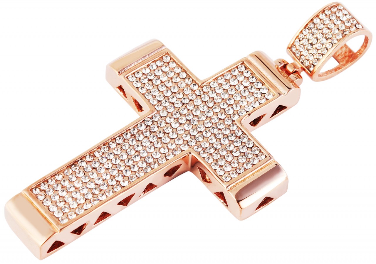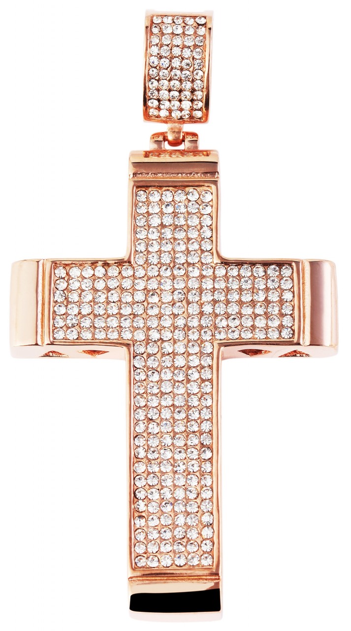 O pingente da marca em forma de uma grande cruz é feito de aço inoxidável e adicionalmente revestido com IP. Este revestimento melhora a aparência do material. A cruz é decorada com 248 pedras simili, o ilhó da corrente é cravejado com outras 50 pedras simili. O pingente é oco por dentro e o padrão de favo de mel aberto nas costas e nas laterais permite que você veja o interior do pingente de aço inoxidável. O pingente cruzado tem dimensões de: comprimento 67 mm, largura 46 mm e espessura 6,5 mm.