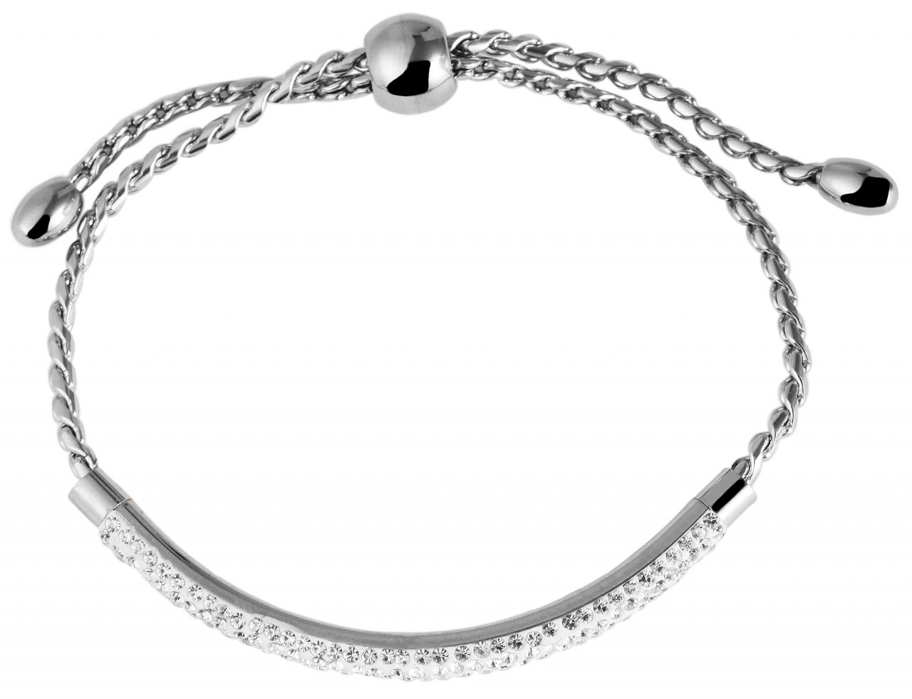 A pulseira feminina em padrão de corrente é feita de aço inoxidável. No meio da pulseira há um elemento de aço inoxidável, que é colocado uniformemente em quatro fileiras com um total de 164 pedras simili. A pulseira pode ser ajustada individualmente e adaptada a qualquer pulso através de um prático fecho adornado com uma pérola semicircular de 9 mm de diâmetro. Graças às pedras simil radiantes, a pulseira de aço inoxidável chama a atenção. A pulseira tem comprimento total de 23 cm, largura de 4 mm e espessura de 2 mm.