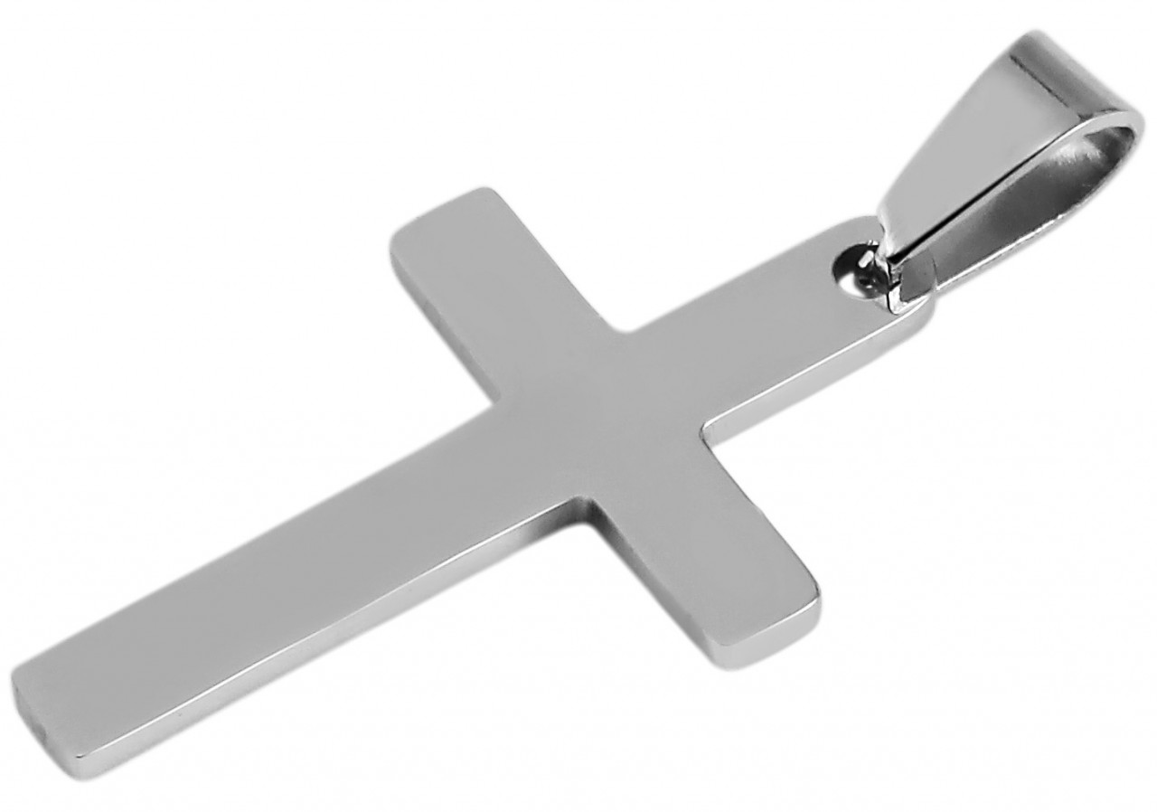 O pingente da marca em forma de cruz é feito de aço inoxidável. O material promete uma longa vida útil. O pingente de cruz simples é prateado e pode ser fornecido com pequenas gravuras. As dimensões são: comprimento 29 mm, largura 17 mm e espessura 2 mm.