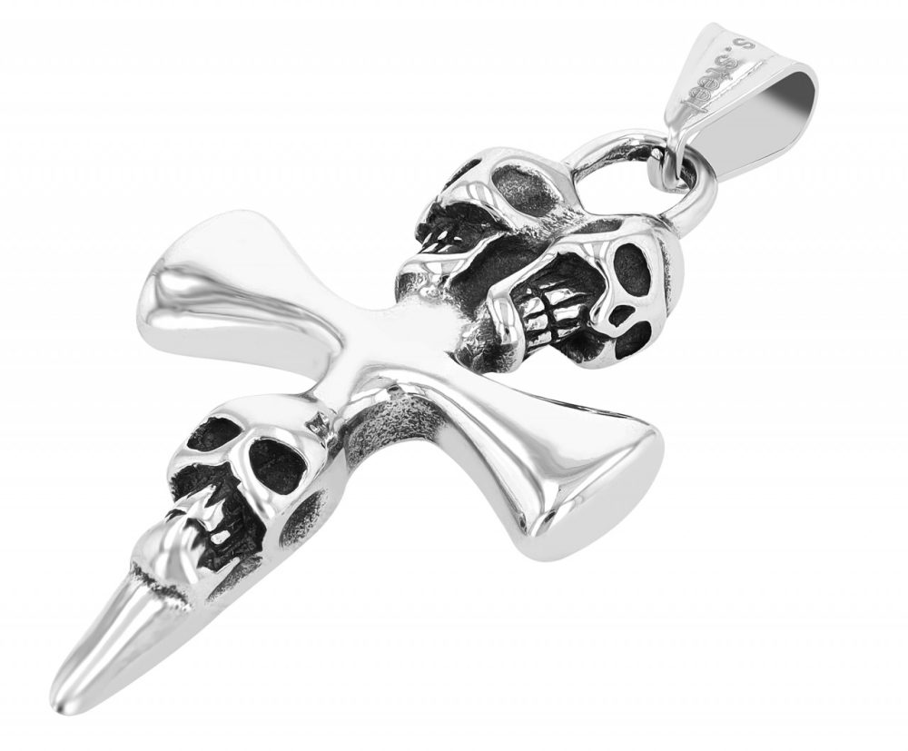 O enorme pingente impressiona pelas suas impressionantes dimensões de 50 x 29 x 7 mm e confere-lhe uma presença substancial. A utilização do aço inoxidável promete não só robustez, mas também uma estética duradoura que resistirá ao passar do tempo. A característica marcante deste pingente de cruz são as caveiras que decoram a cruz de uma forma única.