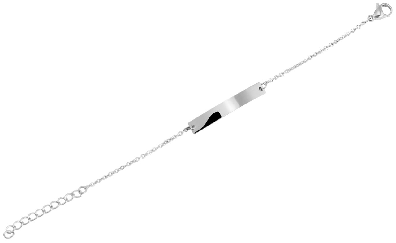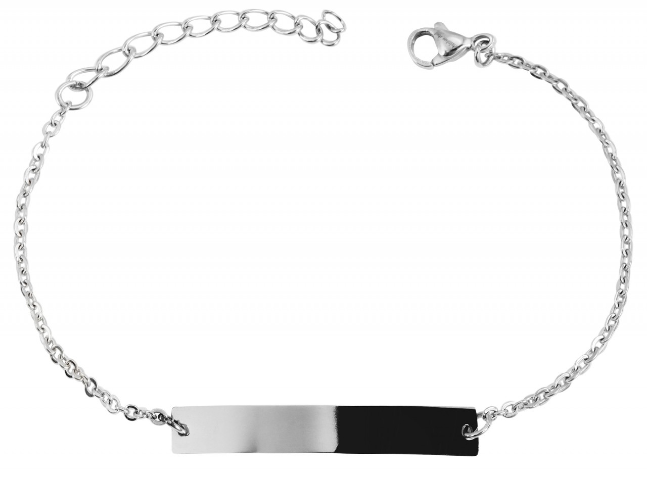 A faixa de identificação infantil, para todo o tipo de gravuras, é fabricada em aço inoxidável. O fecho é um mosquetão de aço inoxidável. A superfície é altamente polida. A faixa tem 12 cm de comprimento e pode ser estendida em 3 cm. A espessura da banda é de 1 mm. A placa de gravação tem 32 mm de comprimento, 5 mm de largura e 1 mm de espessura.
