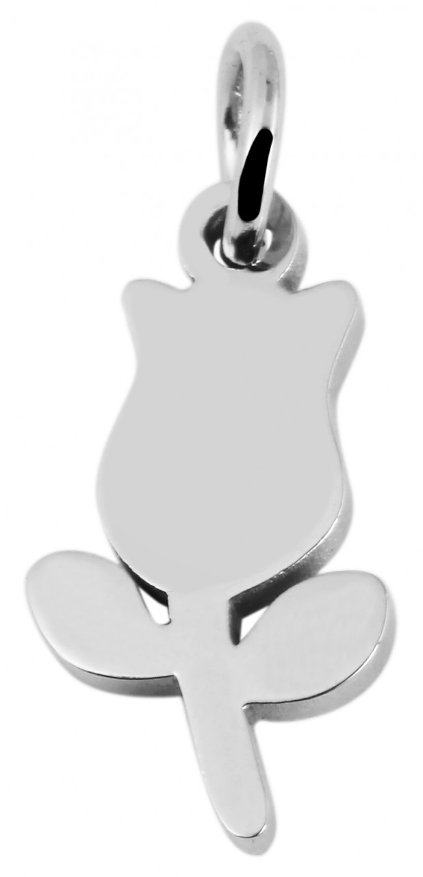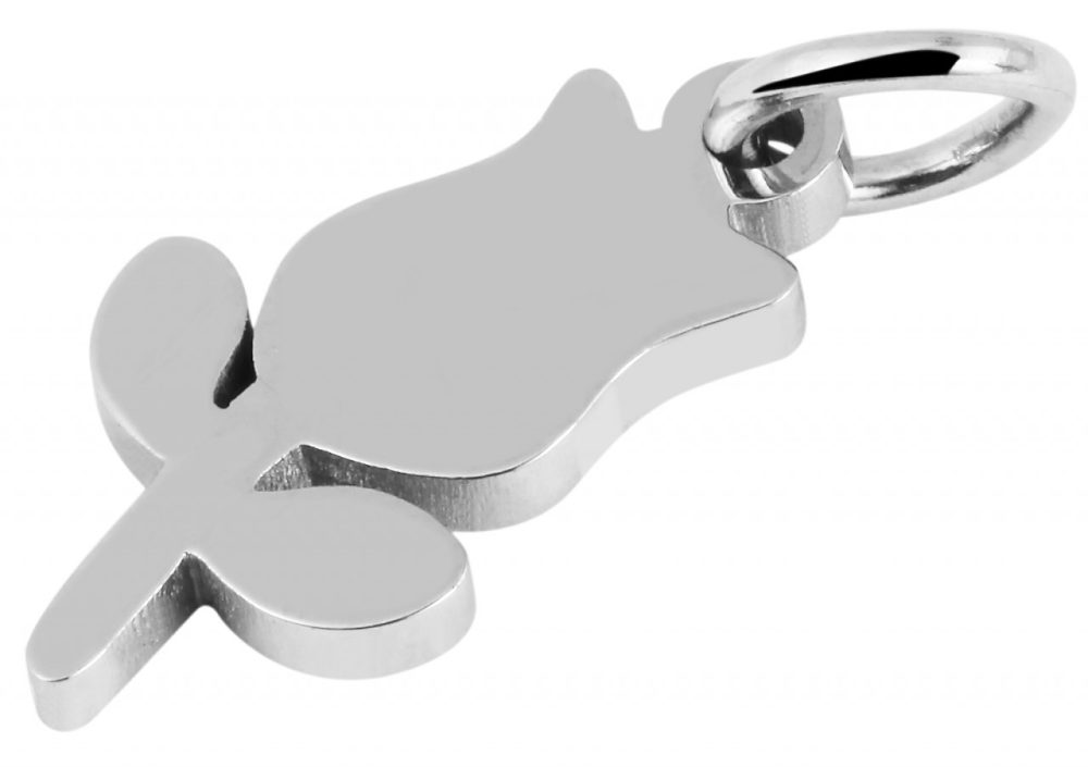 O pingente da marca em forma de flor é feito de aço inoxidável e é prateado. O pingente pode ser fornecido com pequenas gravuras de qualquer tipo. As dimensões do pingente são comprimento de 16 mm, largura de 9 mm e espessura de 1 mm.