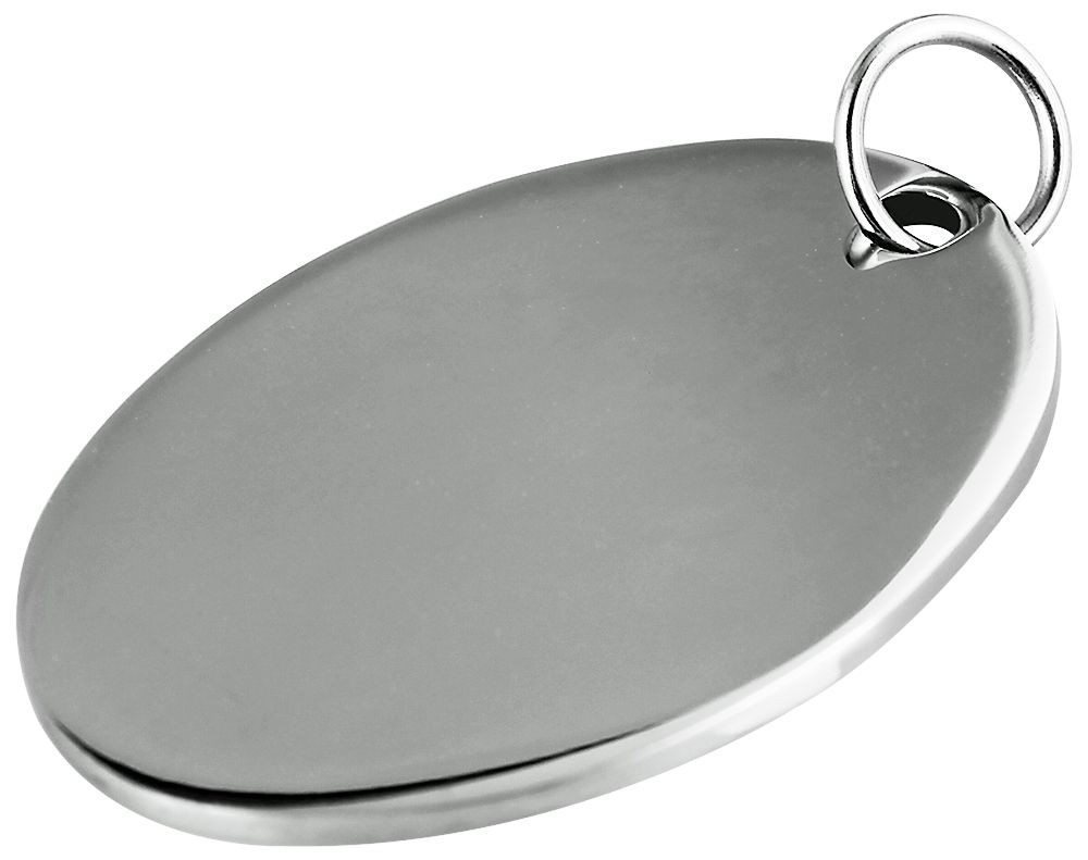 O pingente gravado da marca Akzent foi feito de aço inoxidável. O pingente oval está disponível em diversas cores e pode ser gravado. O tamanho do pingente é 35 mm de comprimento, 25 mm de largura e 1 mm de espessura. Este produto é entregue em um cartão decorativo branco. Tem dimensões de 70 x 45 mm e é ideal para apresentar no expositor adequado ou para embalar como presente.