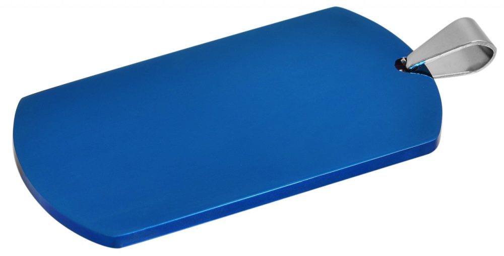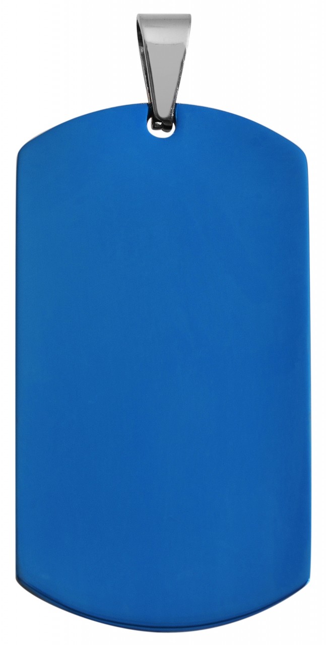 O pingente de gravação, para todos os tipos de gravuras, da marca Akzent é feito de aço inoxidável e também possui revestimento IP. A cor do pingente é azul, o ilhó é prateado. A superfície é altamente polida. As dimensões são: comprimento 50 mm, largura 27 mm e espessura 2 mm.