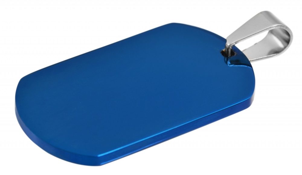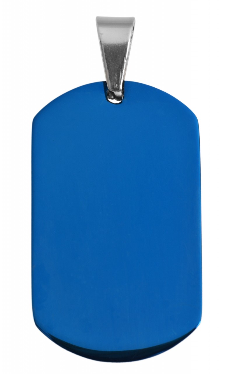 O pingente de gravação, para todos os tipos de gravuras, da marca Akzent é feito de aço inoxidável e adicionalmente fornecido com revestimento iônico. O pingente é azul e altamente polido. O ilhó é prateado. As dimensões do item são 37 mm de comprimento, 22 mm de largura e 2 mm de espessura.