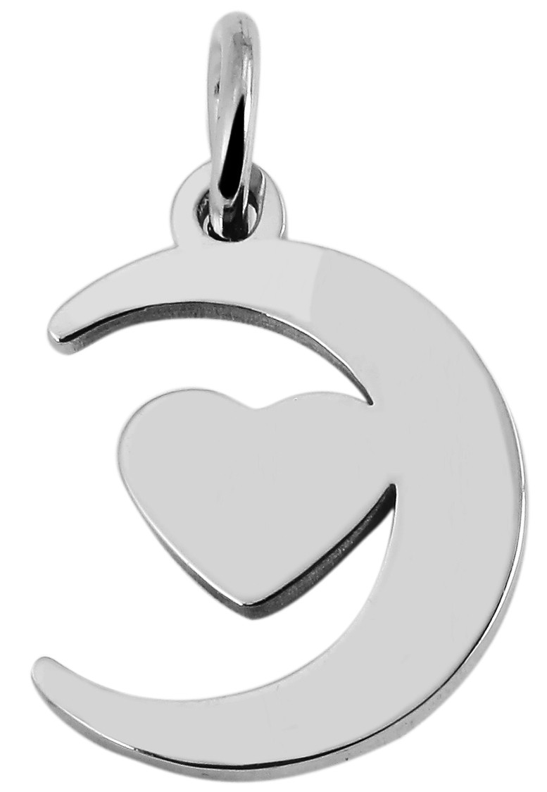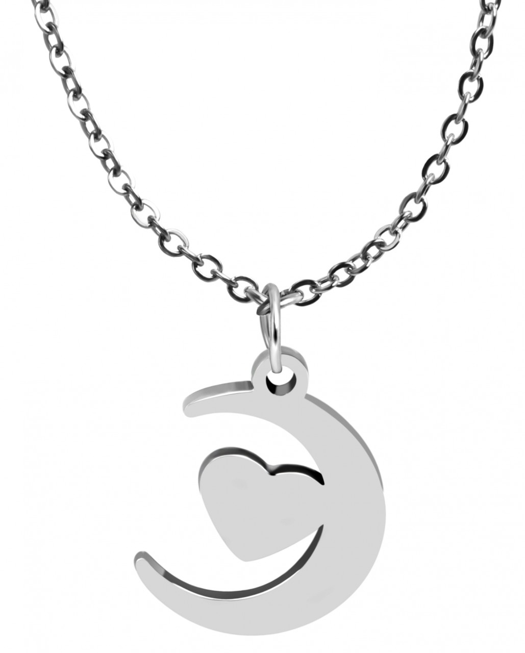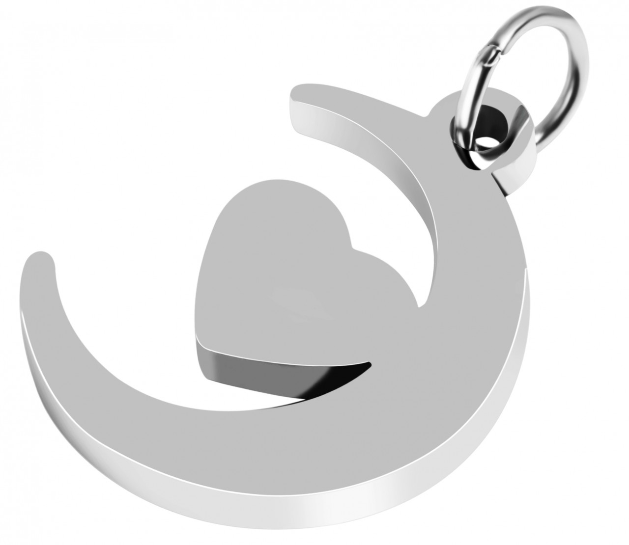 O pingente da marca Akzent é feito de aço inoxidável no formato de uma lua crescente com um pequeno coração. O pingente é prateado e tem uma aparência polida. Preso a um laço de corrente redondo, o pingente de aço inoxidável pode ser preso a uma ampla variedade de correntes. As dimensões do pingente pequeno são 16 mm de comprimento, 13 mm de largura e 1,5 mm de espessura.