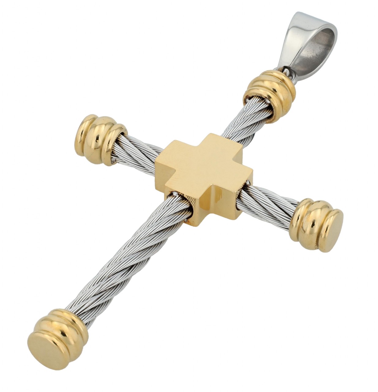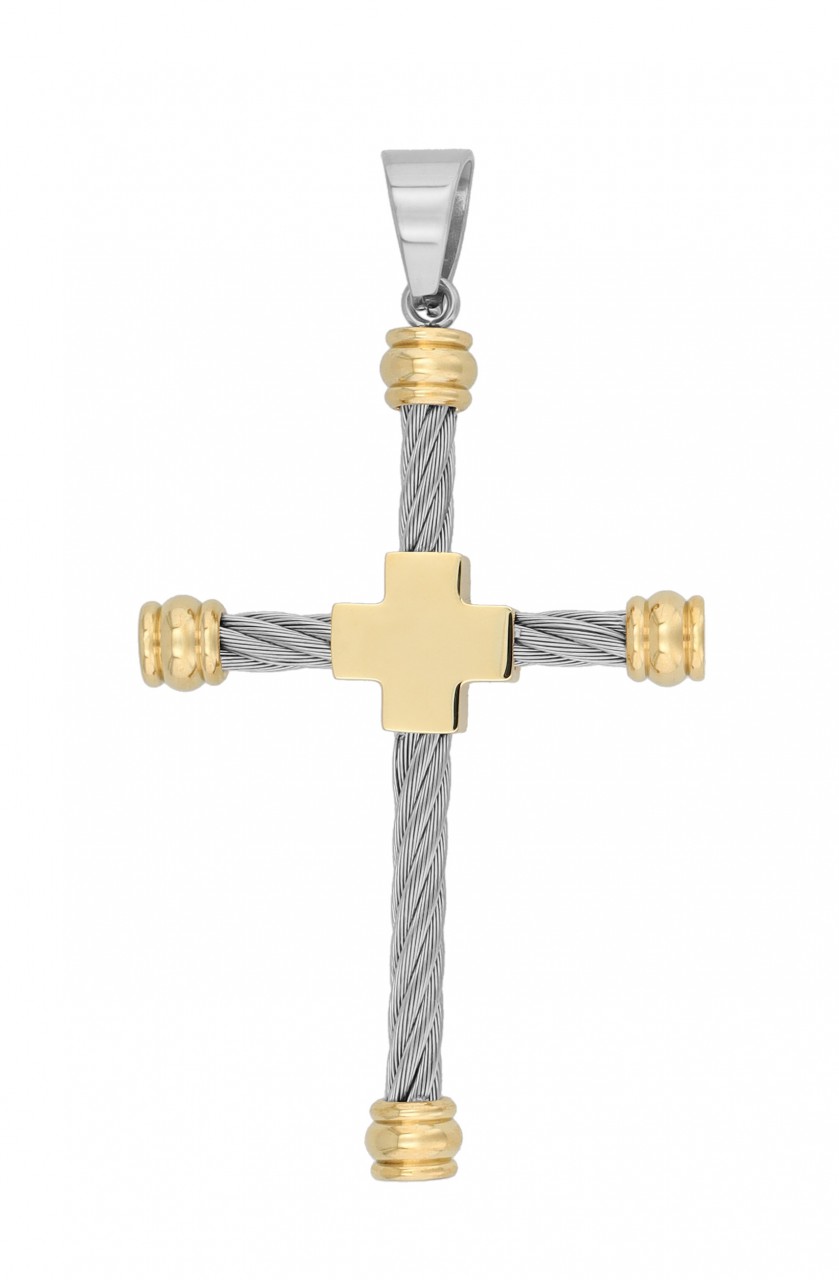 Este enorme pingente de cruz medindo 70 x 42 x 6 mm impressiona não só pelo seu tamanho, mas também pelo seu peso de 14,18 gramas, o que lhe confere uma presença sólida. Feito em aço inoxidável de alta qualidade, este pingente não é apenas resistente, mas também hipoalergénico e durável, tornando-o um companheiro ideal para o uso diário. O design consiste em um tipo de fio em aço inoxidável que se combina habilmente para criar uma imagem geral impressionante. No meio do pingente há uma cruz polida que impressiona pelo seu formato claro e brilho. Este design especial confere a este pingente uma aparência muito moderna e o torna um acessório absoluto para clientes atentos às tendências que apreciam qualidade e estilo.