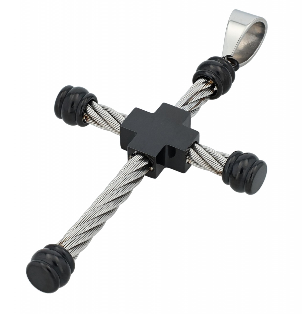 Este enorme pingente de cruz medindo 70 x 42 x 6 mm impressiona não só pelo seu tamanho, mas também pelo seu peso de 14,18 gramas, o que lhe confere uma presença sólida. Feito em aço inoxidável de alta qualidade, este pingente não é apenas resistente, mas também hipoalergénico e durável, tornando-o um companheiro ideal para o uso diário. O design consiste em um tipo de fio em aço inoxidável que se combina habilmente para criar uma imagem geral impressionante. No meio do pingente há uma cruz polida que impressiona pelo seu formato claro e brilho. Este design especial confere a este pingente uma aparência muito moderna e o torna um acessório absoluto para clientes atentos às tendências que apreciam qualidade e estilo.