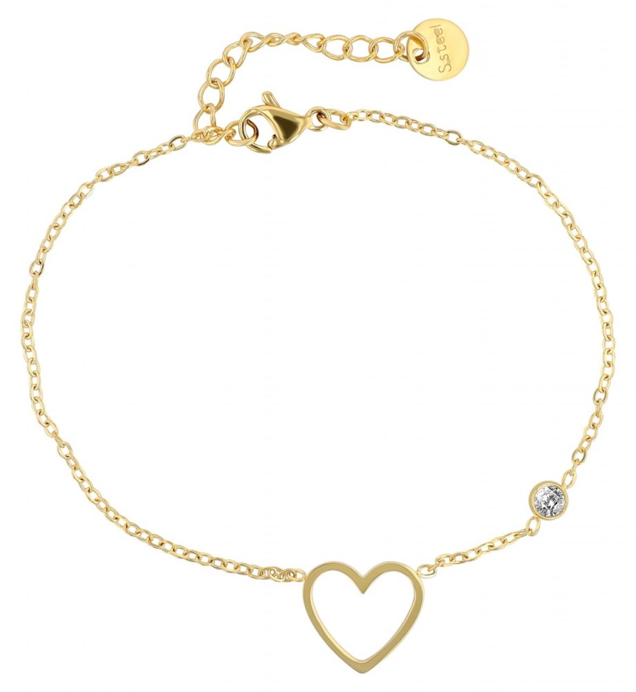 Pulseira em aço inoxidável “Anjul”, coração prateado e dourado, 1,2 x 1,1 cm. 1 zircão redondo 17 cm + extensão 3 cm. Fecho lagosta.
