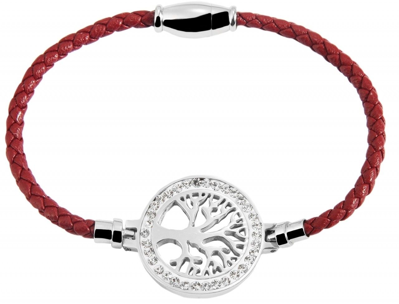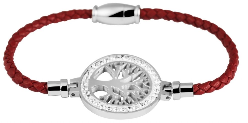 A pulseira de imitação de couro da marca Praktik é feita de uma pulseira trançada. No centro existe um elemento de aço inoxidável em forma de círculo que inclui uma árvore da vida. A parte externa do círculo é incrustada com 35 pedras simili. A moderna pulseira de joias pode ser aberta e fechada com um prático fecho magnético. O comprimento total da pulseira é de 18 cm. Tem 2,2 cm de largura no ponto mais largo e a espessura do material é de 3 mm.