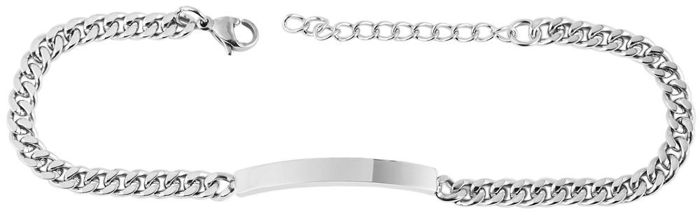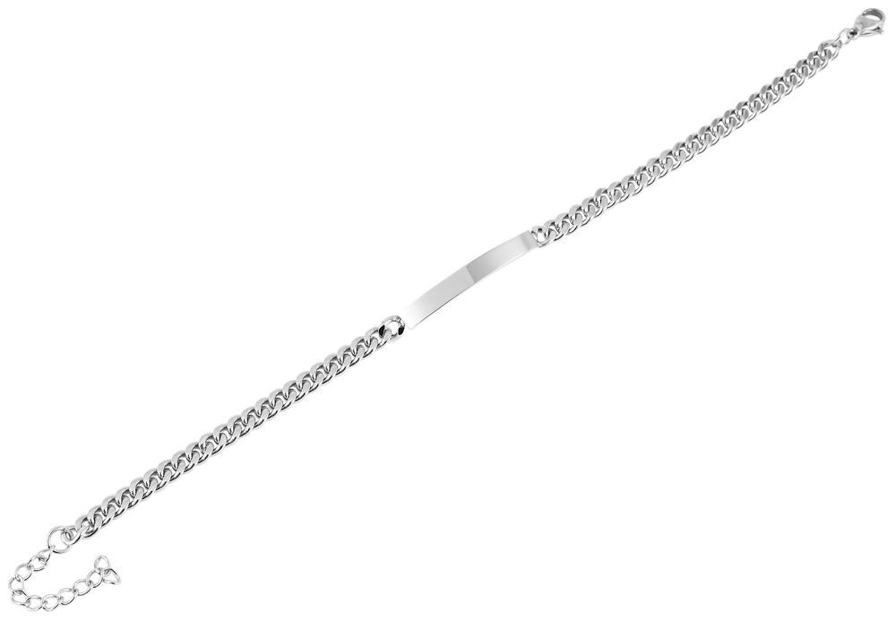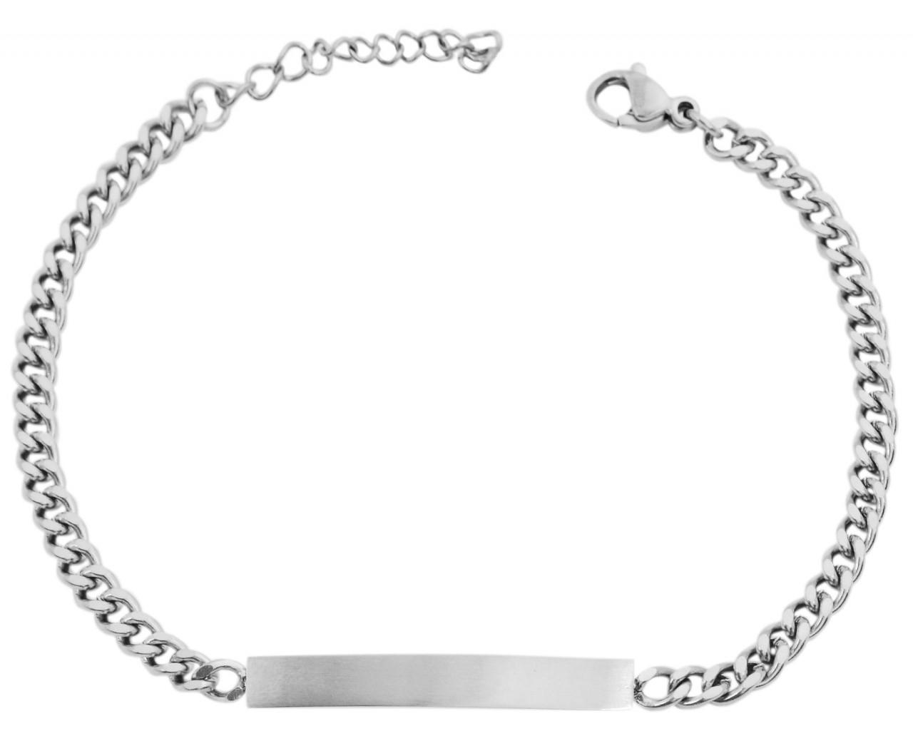 A pulseira de realce é feita de aço inoxidável e possui uma placa de identificação com 30 mm de comprimento e 5 mm de largura no meio. Tem uma espessura de 2 mm, é mate e oferece área suficiente para receber vários tipos de gravuras. As dimensões da pulseira de joalheria são um comprimento total de 21 cm, incluindo uma corrente de extensão de 3 cm de comprimento, largura de 3,5 mm e espessura de material de 2 mm. A pulseira simples pode ser aberta e fechada com um mosquetão de aço inoxidável. Esta pulseira de joias é o presente ideal com um toque individual.