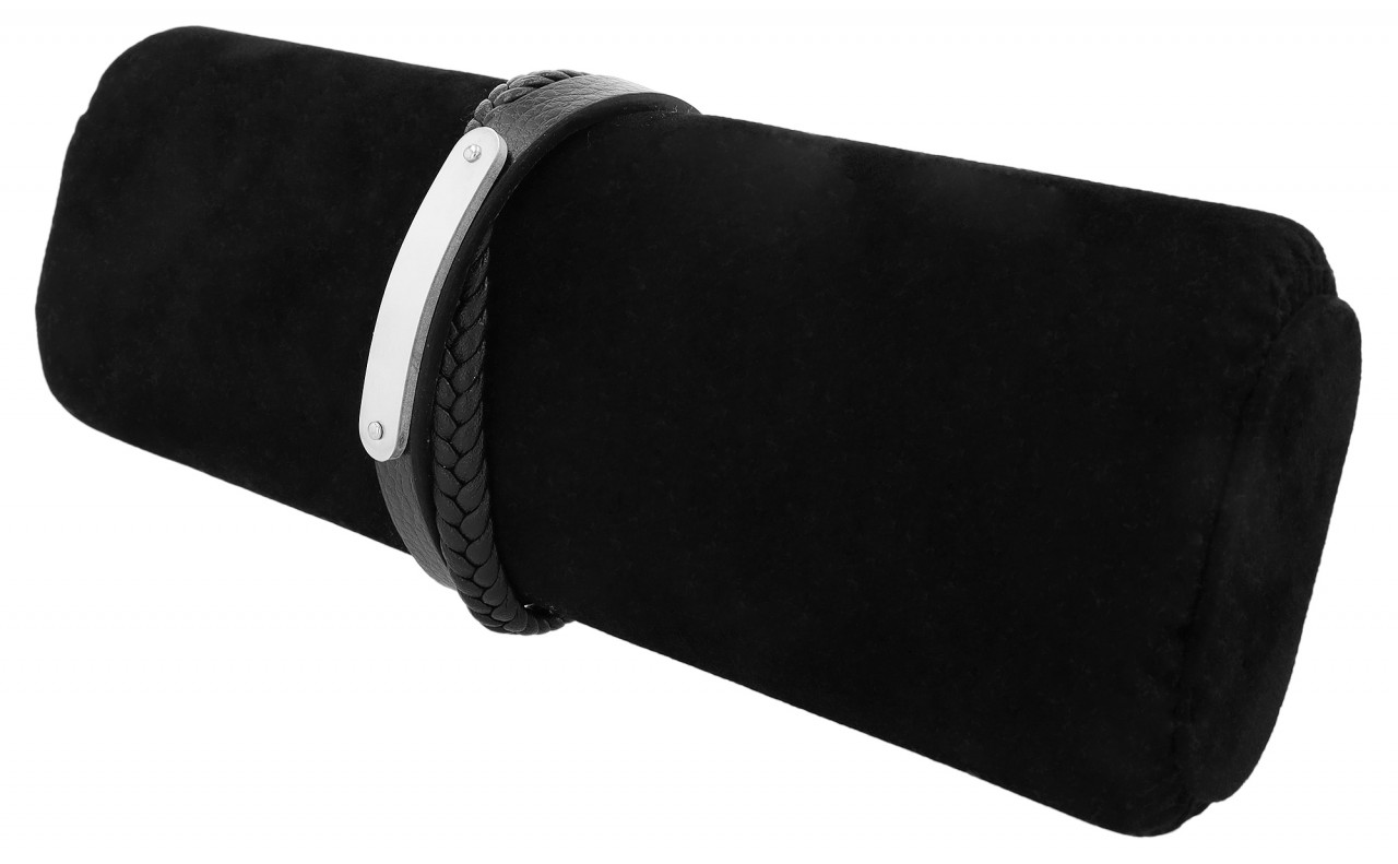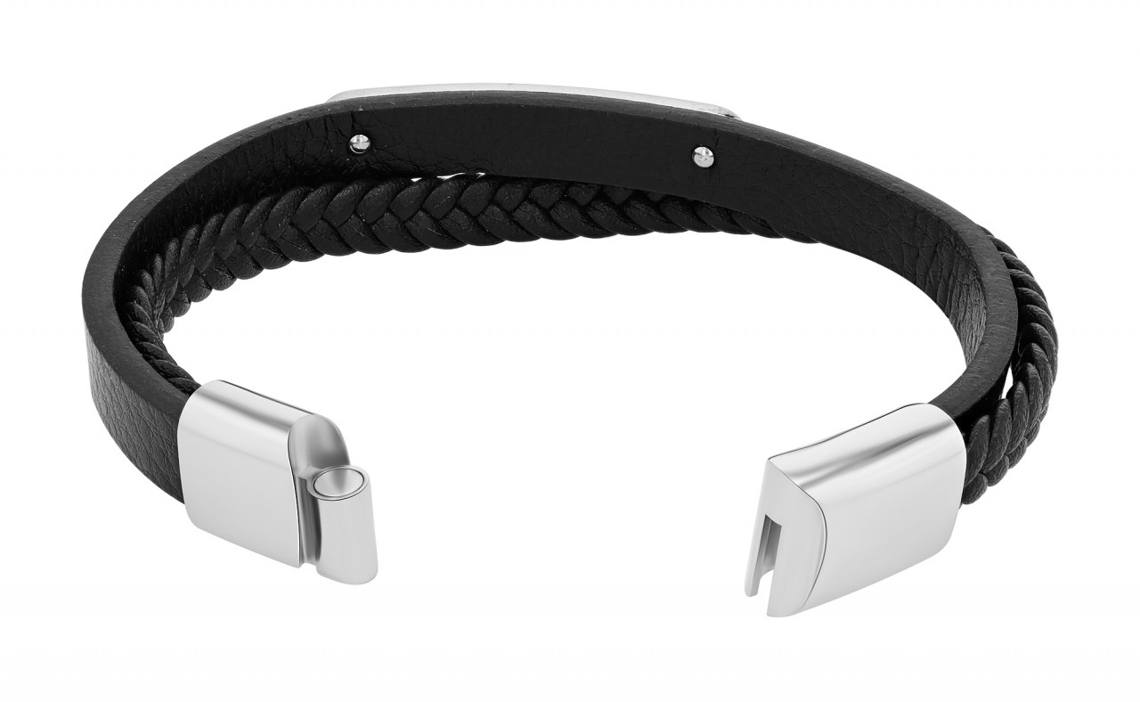 A pulseira da marca Akzent é feita de couro genuíno. Consiste em uma pulseira de couro e uma pulseira de couro trançada. Há uma placa de identificação na pulseira de couro. Isto pode ser fornecido com todos os tipos de gravuras. A placa de gravação fosca tem comprimento de 46 mm, largura de 8 mm e espessura de 2 mm. Graças à possibilidade de diversas gravuras, a pulseira joalheria é ideal como presente personalizado. Com um prático fecho magnético de aço inoxidável, a pulseira pode ser operada facilmente. A cor da pulseira de couro é preta, os elementos e o fecho são prateados. O tamanho total da pulseira consiste em um comprimento de 21,5 cm mais o elemento de extensão de 1,5 cm, largura de 17 mm e espessura de 8 mm.