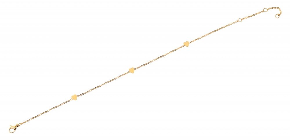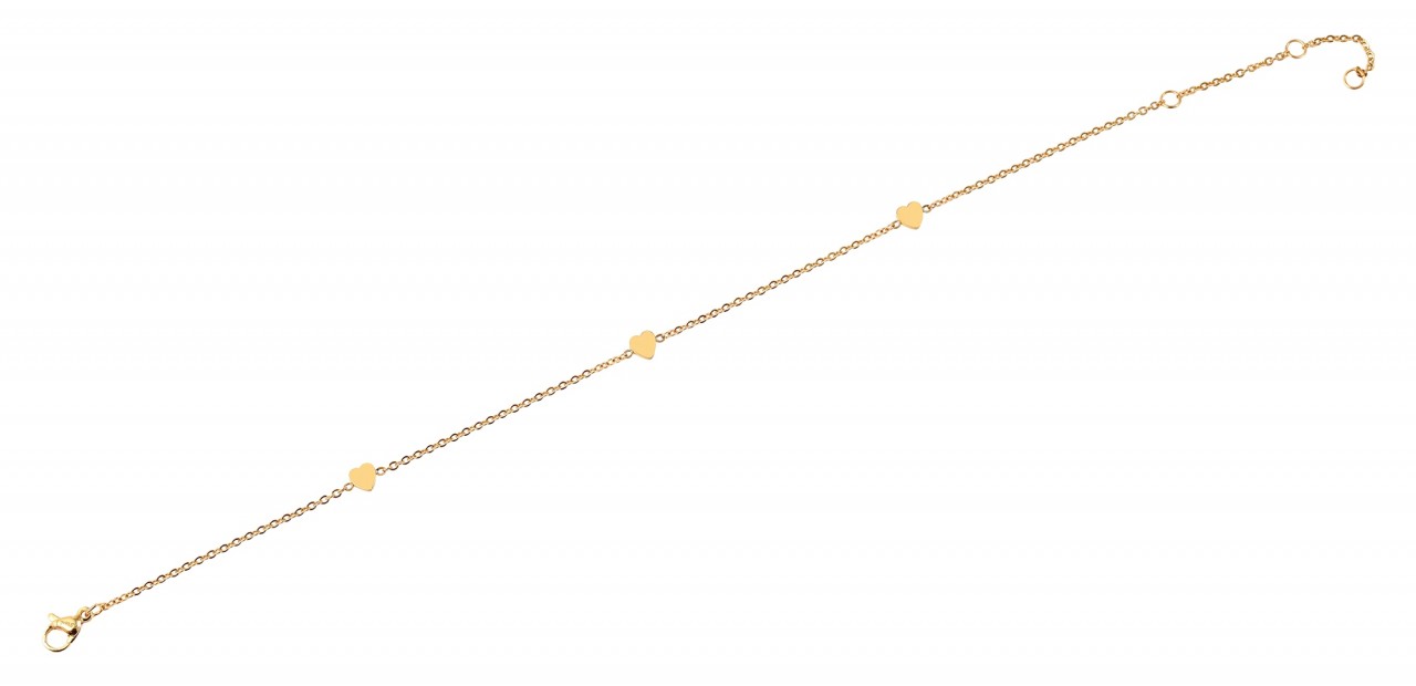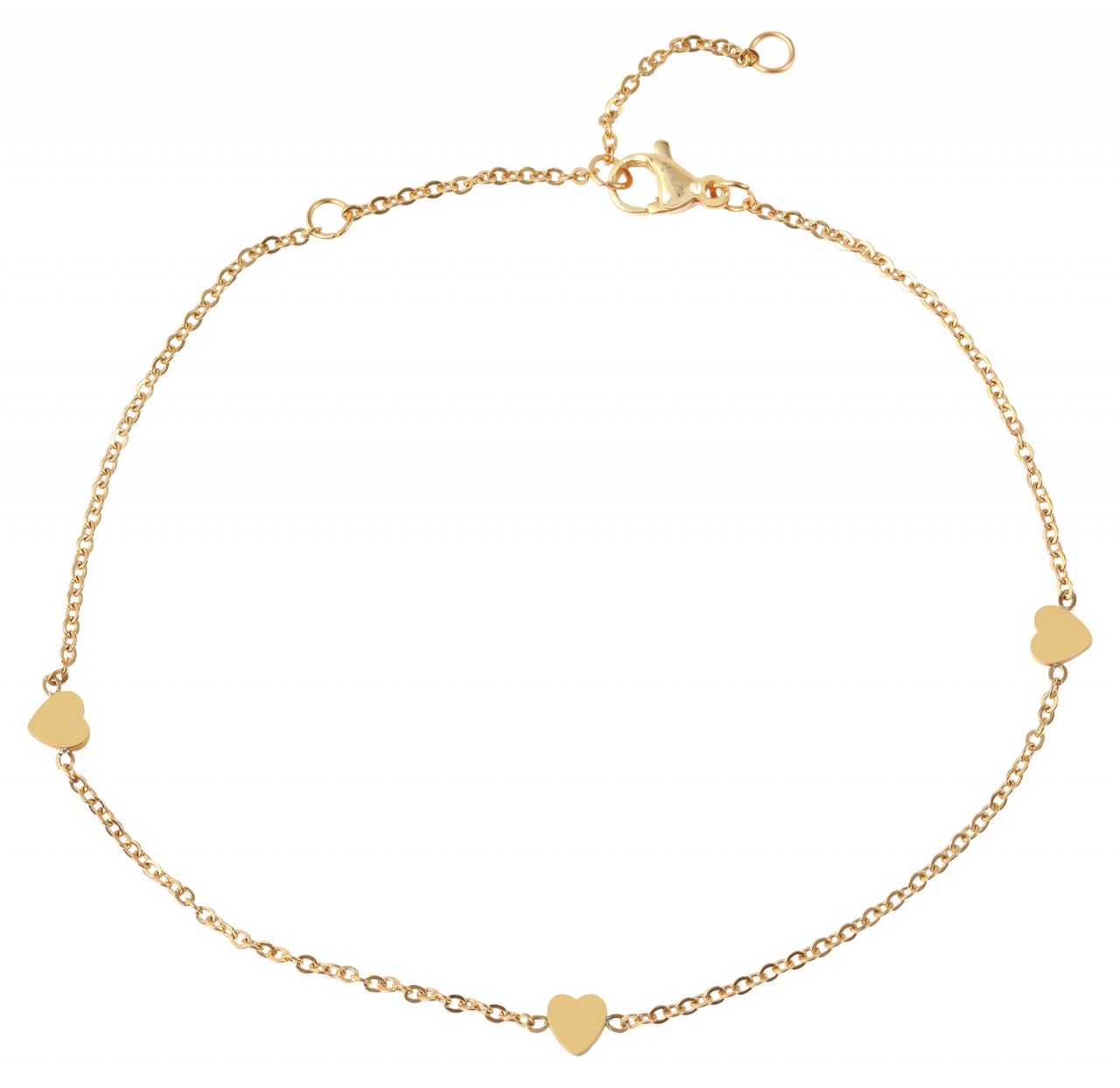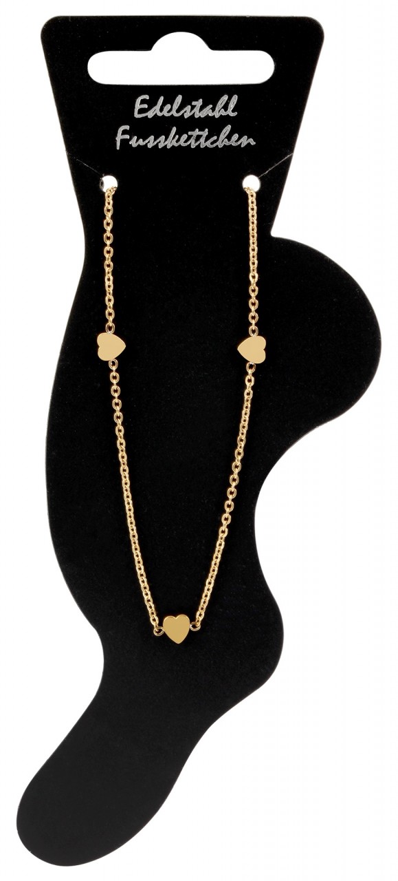A pulseira de pé da marca Praktik é confeccionada em aço inoxidável no padrão corrente âncora e está disponível em diversas cores. A corrente tem 22 cm de comprimento e é decorada com três corações de aço inoxidável de 5 mm de largura e 5 mm de comprimento em intervalos regulares. A divertida pulseira pode ser aberta e fechada com um mosquetão, que também é feito de aço inoxidável. Além disso, uma corrente de extensão de 5 cm de comprimento é fixada na extremidade da joia do pé. Isto permite variar o comprimento em até 5 cm e adaptar a corrente a qualquer tornozelo.