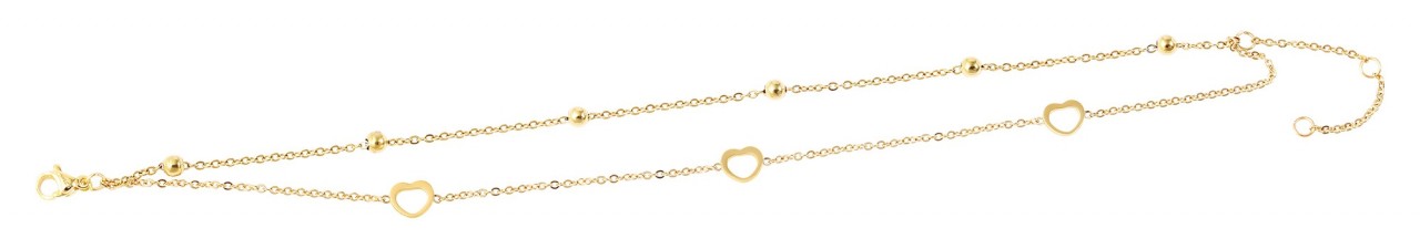 A pulseira da marca Praktik é feita de aço inoxidável e é composta por duas correntes de ancoragem de comprimentos diferentes. Em uma corrente há pequenas esferas de aço inoxidável em intervalos regulares. Numa das extremidades existe ainda uma corrente extensora com 2,5 cm de comprimento, que permite variar o comprimento individualmente e assim adaptar-se a qualquer tornozelo. A outra corrente é decorada com pequenos corações. Quando combinadas, as duas correntes criam uma pulseira moderna. A divertida pulseira pode ser aberta e fechada com um mosquetão, que também é feito de aço inoxidável. As dimensões resultam de um comprimento de 25 cm e uma espessura de corrente de 1 mm.