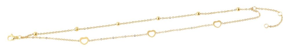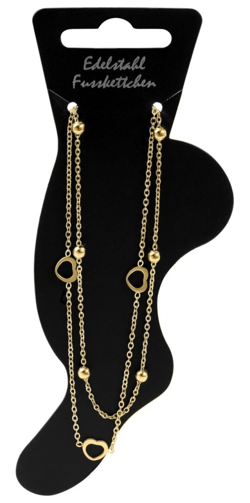 A pulseira da marca Praktik é feita de aço inoxidável e é composta por duas correntes de ancoragem de comprimentos diferentes. Em uma corrente há pequenas esferas de aço inoxidável em intervalos regulares. Numa das extremidades existe ainda uma corrente extensora com 2,5 cm de comprimento, que permite variar o comprimento individualmente e assim adaptar-se a qualquer tornozelo. A outra corrente é decorada com pequenos corações. Quando combinadas, as duas correntes criam uma pulseira moderna. A divertida pulseira pode ser aberta e fechada com um mosquetão, que também é feito de aço inoxidável. As dimensões resultam de um comprimento de 25 cm e uma espessura de corrente de 1 mm.