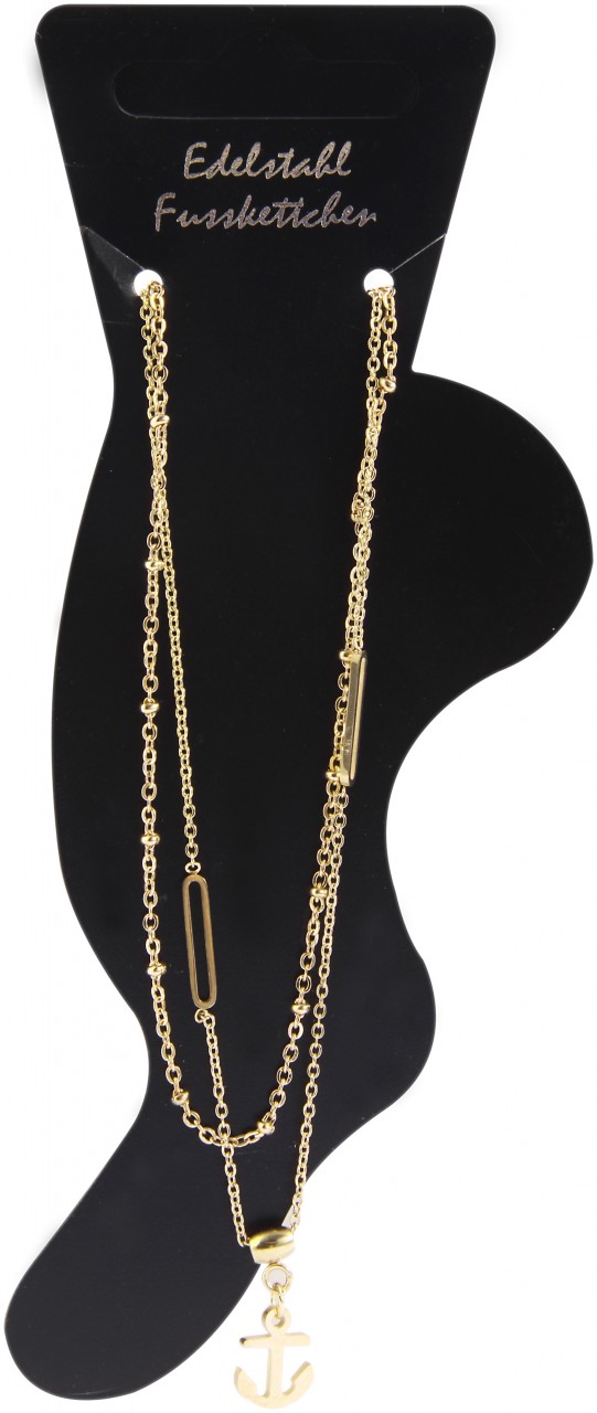 A pulseira de pé marítima da marca Akzent é feita de aço inoxidável. A corrente com padrão de âncora é decorada com dois elementos alongados de aço inoxidável e um pequeno pingente de âncora. Pode ser aberto e fechado com mosquetão, também feito de aço inoxidável. Uma corrente extensora de 5 cm de comprimento presa a uma das pontas da corrente permite variar o comprimento em até 5 cm, para que a pulseira de pé se adapte a qualquer tornozelo. As dimensões resultam de um comprimento de 24 cm e uma espessura de corrente de 1 mm. O pingente de âncora tem 11 mm de largura, 9 mm de comprimento e espessura de material de 1 mm.