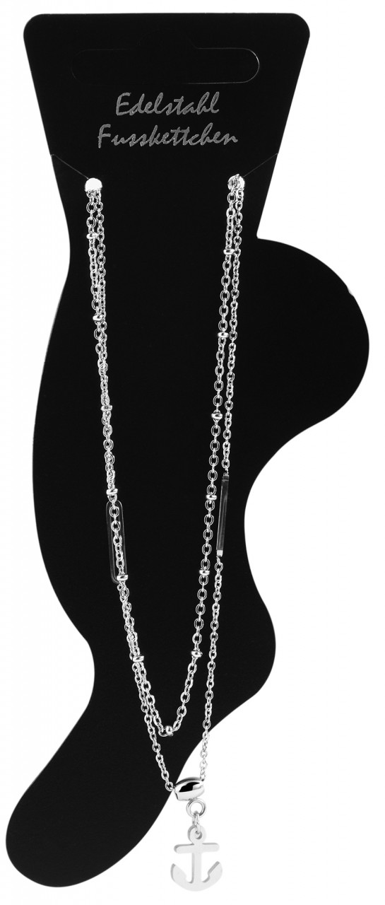 A pulseira de pé marítima da marca Akzent é feita de aço inoxidável. A corrente com padrão de âncora é decorada com dois elementos alongados de aço inoxidável e um pequeno pingente de âncora. Pode ser aberto e fechado com mosquetão, também feito de aço inoxidável. Uma corrente extensora de 5 cm de comprimento presa a uma das pontas da corrente permite variar o comprimento em até 5 cm, para que a pulseira de pé se adapte a qualquer tornozelo. As dimensões resultam de um comprimento de 24 cm e uma espessura de corrente de 1 mm. O pingente de âncora tem 11 mm de largura, 9 mm de comprimento e espessura de material de 1 mm.