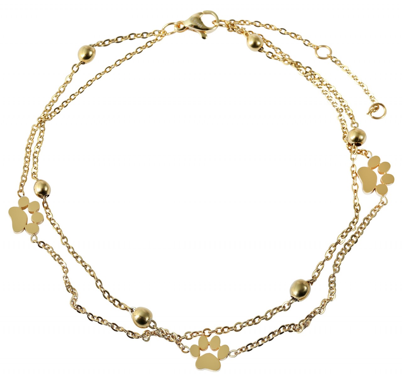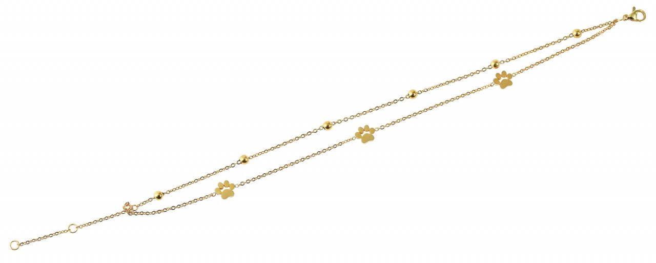 A pulseira de pé de duas carreiras da marca Akzent é feita de aço inoxidável e está disponível em diversas cores. A primeira fila de correntes é espaçada uniformemente com elementos esféricos de aço inoxidável, a segunda fila com elementos de aço inoxidável em forma de patas fofas. As dimensões da corrente de tornozelo são comprimento de 24 cm, largura de 1 mm e espessura de 1 mm. Além disso, uma corrente de extensão de 5 cm de comprimento é presa a uma extremidade da corrente para variar o comprimento em até 5 cm. A corrente pode ser aberta e fechada com um fecho mosquetão, também feito de aço inoxidável.