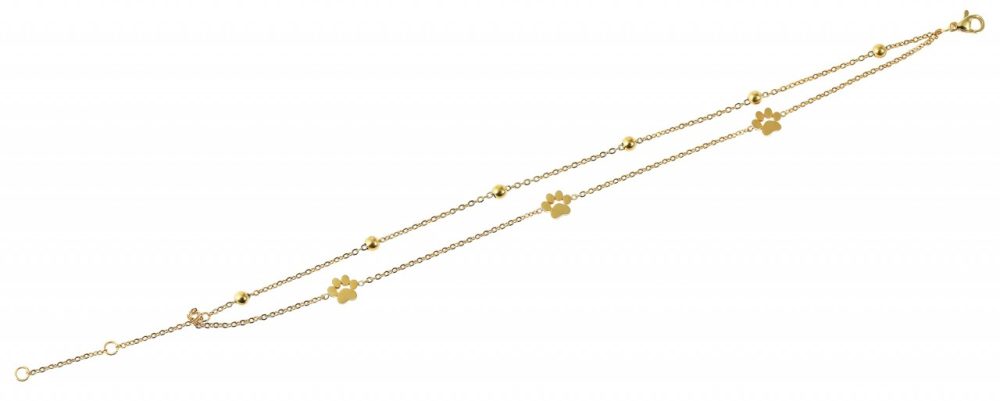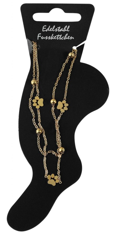 A pulseira de pé de duas carreiras da marca Akzent é feita de aço inoxidável e está disponível em diversas cores. A primeira fila de correntes é espaçada uniformemente com elementos esféricos de aço inoxidável, a segunda fila com elementos de aço inoxidável em forma de patas fofas. As dimensões da corrente de tornozelo são comprimento de 24 cm, largura de 1 mm e espessura de 1 mm. Além disso, uma corrente de extensão de 5 cm de comprimento é presa a uma extremidade da corrente para variar o comprimento em até 5 cm. A corrente pode ser aberta e fechada com um fecho mosquetão, também feito de aço inoxidável.