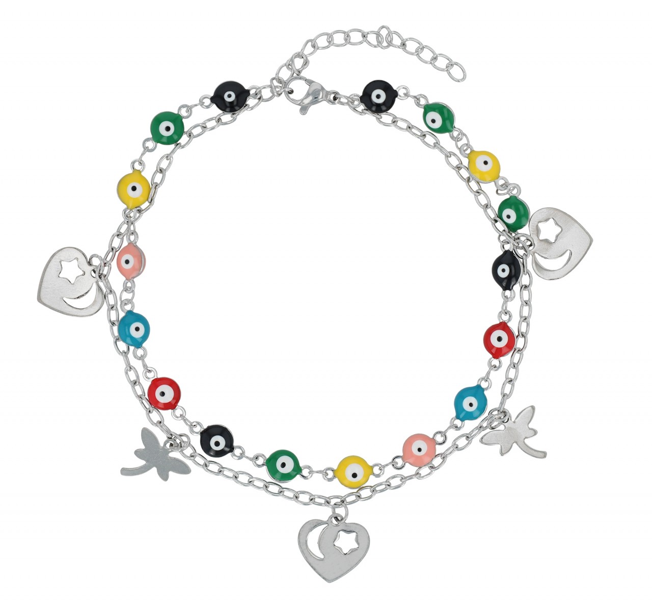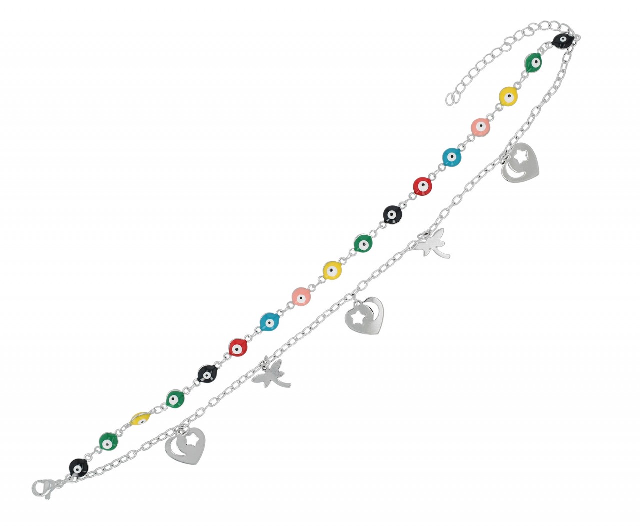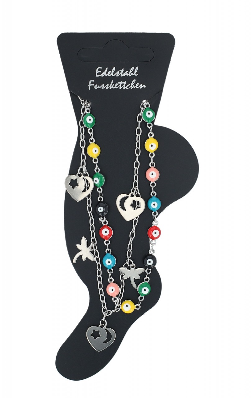 Pulseira de pé Prisara – uma joia que acompanha cada passo com brilho e estilo! Feita em aço inoxidável de alta qualidade e disponível em prateado e dourado, este acessório é um verdadeiro must-have em qualquer coleção de joias. Com comprimento de 23 + 5 cm, largura de 6 mm e espessura de 4 mm, oferece não só um ajuste confortável, mas também durabilidade robusta para o uso diário. As duas correntes criam um quadro geral harmonioso e apresentam designs lúdicos – uma decorada com dois pingentes em forma de palmeiras e três símbolos em forma de coração, a outra com contas coloridas que apresentam o “Olho de Nazar”. O prático fecho mosquetão facilita a colocação e a remoção, e garante uma fixação segura.