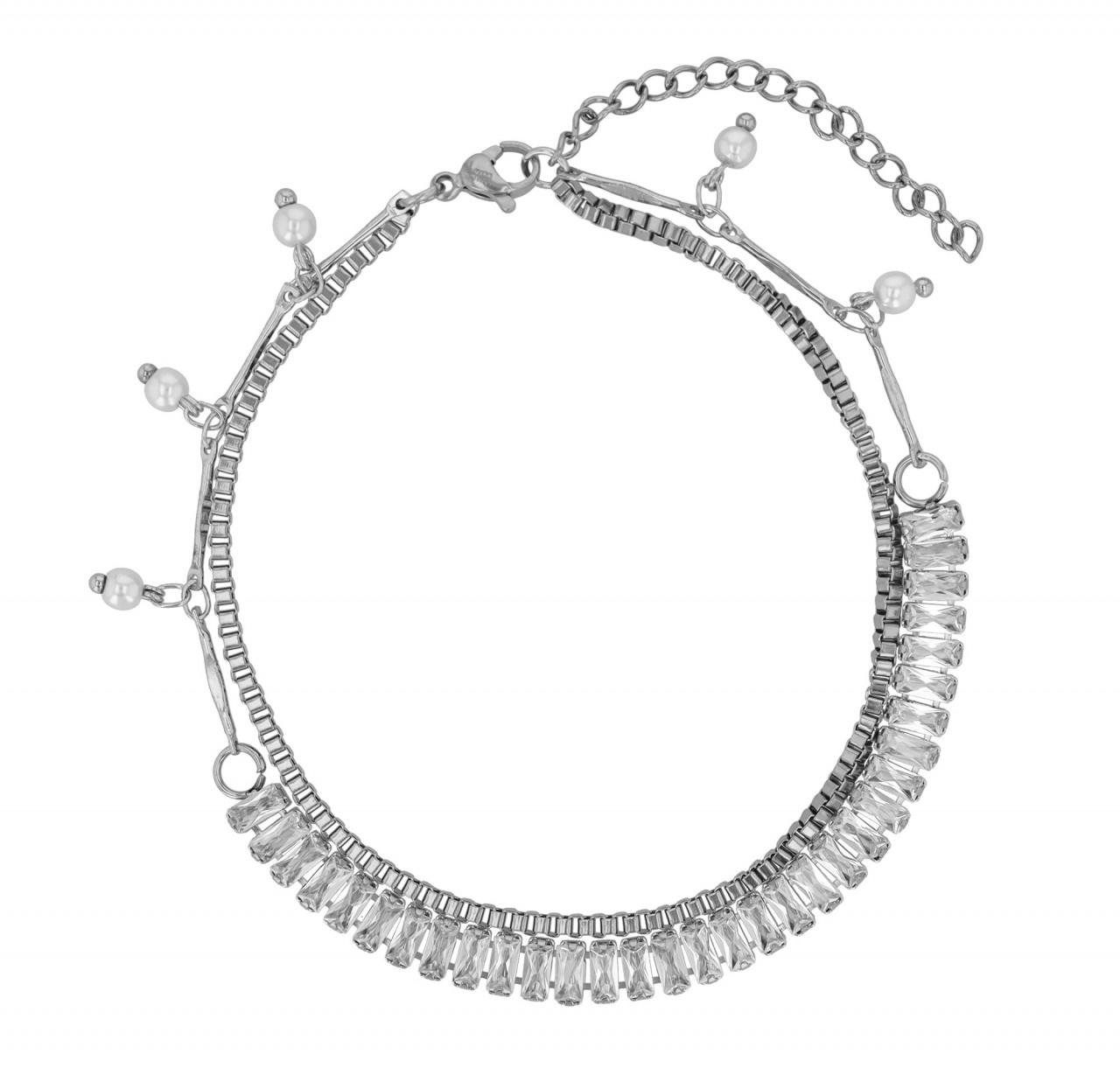 Esta pulseira de pé de duas fileiras combina elementos clássicos com um toque moderno. É feita em aço inoxidável de alta qualidade e acabamento com pérolas artificiais e pedras simili. A pulseira de pé é composta por duas correntes. A primeira corrente é feita em aço inoxidável e oferece uma base resistente e brilhante. A segunda corrente é decorada com pedras simili em forma de baguete dispostas em fileira. É complementado por cinco delicadas pérolas artificiais com diâmetro de 3,5 mm. Medindo 23 cm de comprimento mais uma corrente extensora adicional de 5 cm, esta pulseira de pé oferece um ajuste flexível que pode ser facilmente ajustado para se adequar a diferentes tamanhos. A largura de 7 mm e a espessura de 3 mm garantem uma aparência atraente. Um fecho mosquetão facilita colocar e tirar a pulseira de pé, o que aumenta ainda mais o conforto de uso.